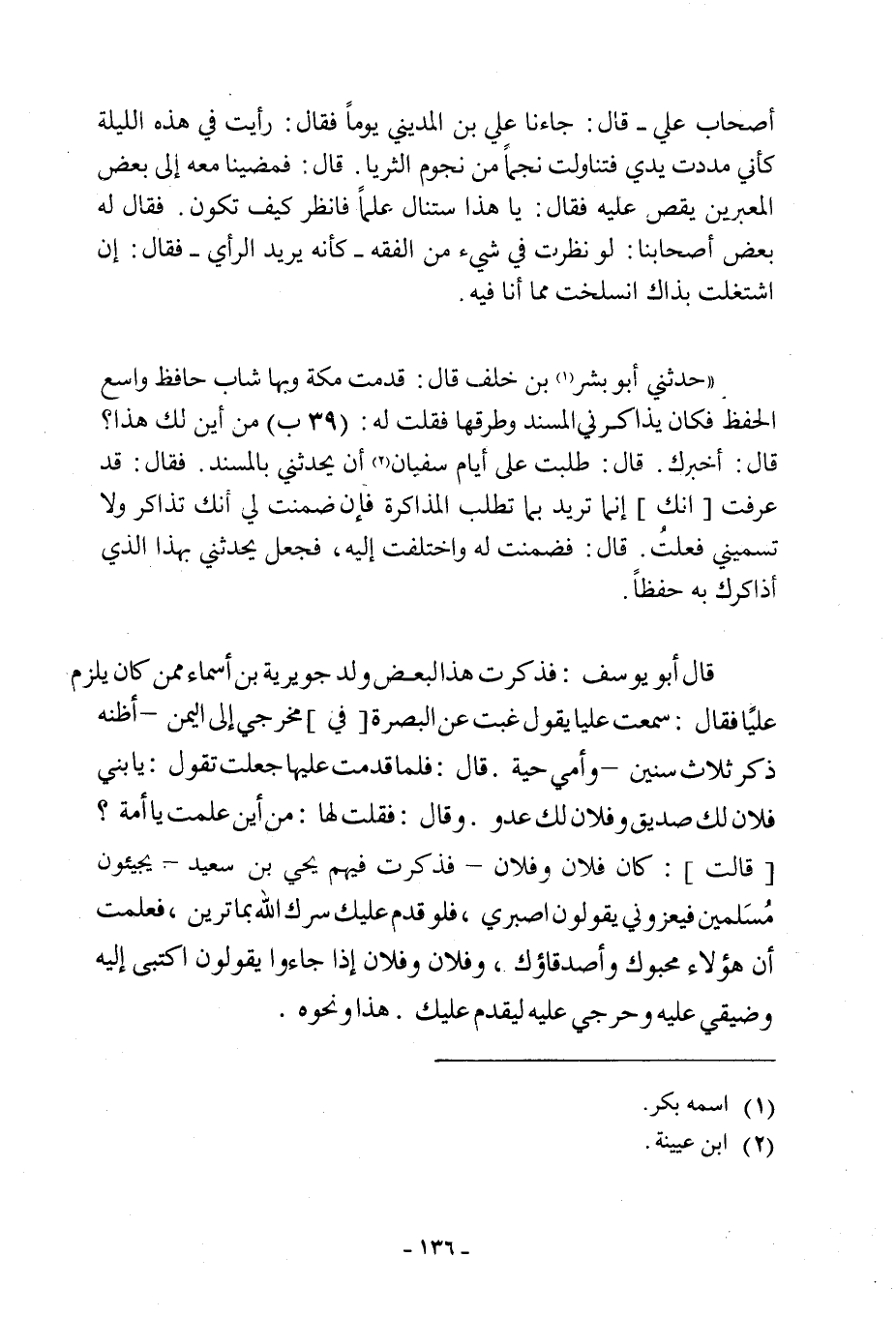 «حَدَّثَنِي أَبُو بِشْرِ [1] بن خلف قال: قدمت مكة وبه شَابٌّ حَافِظٌ وَاسِعُ الْحِفْظِ فَكَانَ يُذَاكِرُ فِي المسند وطرقها فقلت له: (39 ب) مِنْ أَيْنَ لَكَ هَذَا؟ قَالَ: أُخْبِرُكَ. قَالَ: طَلَبْتُ عَلَى أَيَّامِ سُفْيَانَ [2] أَنْ يُحَدِّثَنِي بِالْمُسْنَدِ. فقال: قد عرفت [انك] انما تُرِيدُ بِمَا تَطْلُبُ الْمُذَاكَرَةَ فَإِنْ ضَمِنْتَ لِي أَنَّكَ تُذَاكِرُ وَلَا تُسَمِّينِي فَعَلْتُ. قَالَ: فَضَمِنْتُ له واختلف اليه، فجعل يحدثني بهذا الّذي إذا كرك بِهِ حِفْظًا.