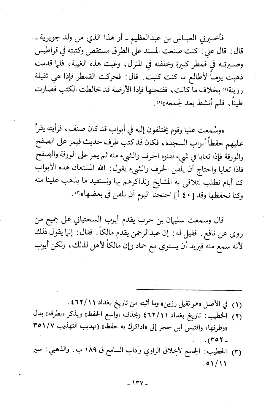 [2] الخطيب: تاريخ بغداد 11/ 462 ويحذف «واسع الحفظ» ويذكر «بطرقه» بدل «وطرقها» واقتبس ابن حجر الى «أذاكرك به حفظا» (تهذيب التهذيب 7/ 351- 352) .
