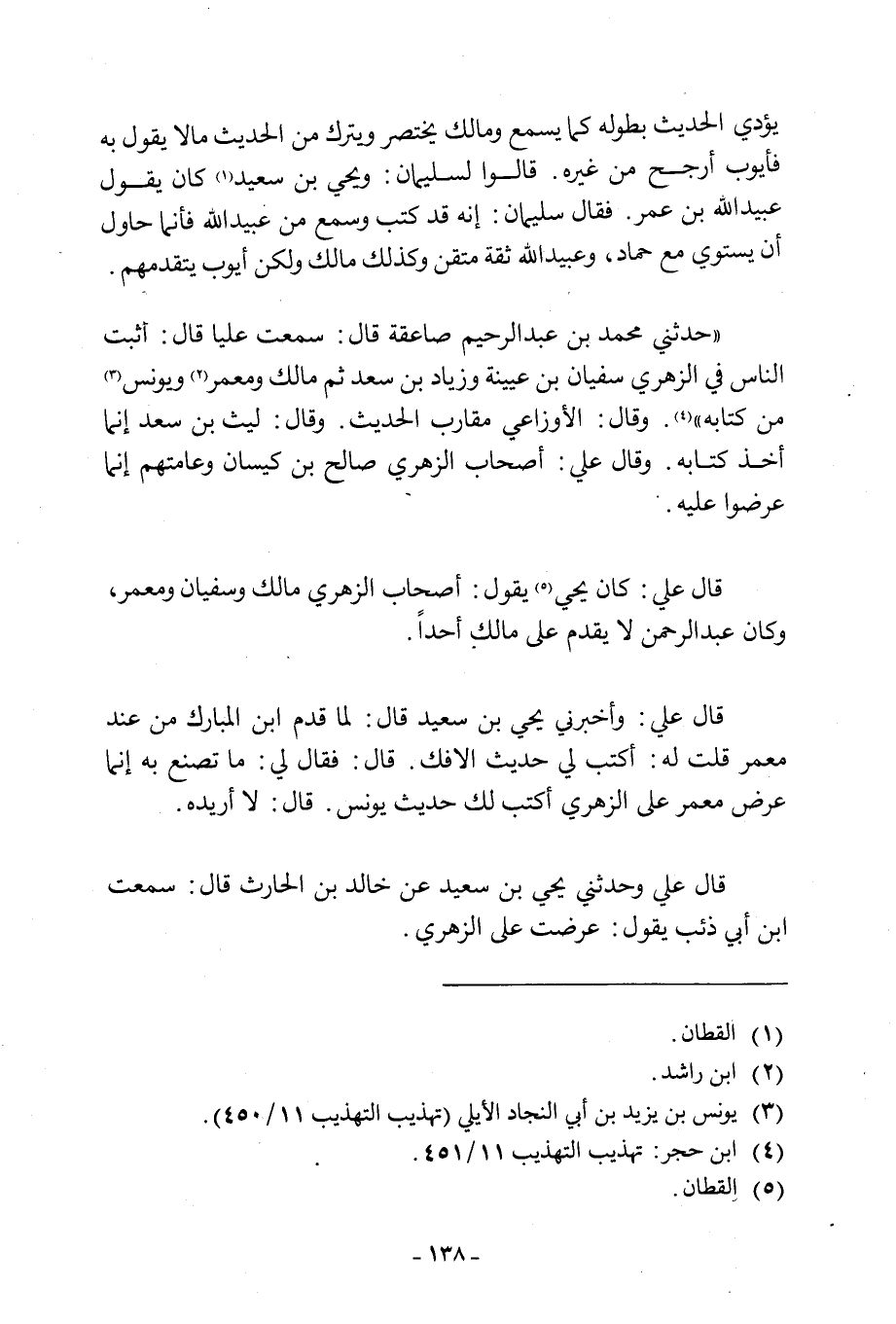 قال علي: كان يحي [5] يَقُولُ: أَصْحَابُ الزُّهْرِي مَالِكٌ وَسُفْيَانُ وَمَعْمَرٌ، وَكَانَ عَبْدُ الرَّحْمَنِ لَا يُقَدِّمُ عَلَى مَالِكٍ أَحَدًا.