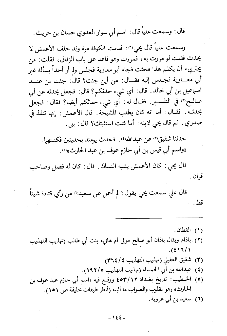 وَسَمِعْتُ عَلِيًّا قَالَ يحي [1] : قَدِمْتُ الْكُوفَةَ مَرَّةً وَقَدْ حَلَفَ الْأَعَمْشُ لَا يُحَدِّثُ فَقُلْتُ لَوْ مَرَرْتَ بِهِ، فَمَرَرْتُ وَهُوَ قَاعِدٌ عَلَى بَابِ الزُّقَاقِ، فَقُلْتُ: