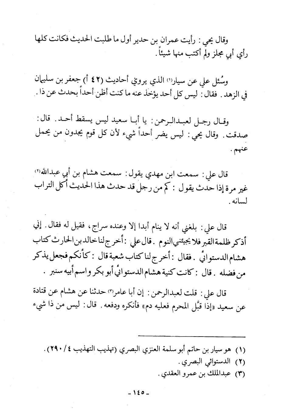 وسئل علي عن سيار [1] الّذي يروي أحاديث (42 أ) جَعْفَرِ بْنِ سُلَيْمَانَ فِي الزُّهْدِ. فَقَالَ: لَيْسَ كُلُّ أَحَدٍ يُؤْخَذُ عَنْهُ مَا كُنْتُ أَظُنُّ أَحَدًا يُحَدِّثُ عَنْ ذَا.