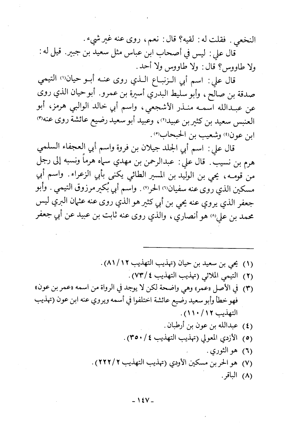 وَاسْمُ أَبِي مِسْكِينٍ الَّذِي رَوَى عَنْهُ سُفْيَانُ [6] الْحُرُّ [7] . وَاسْمُ أَبِي بُكَيْرٍ مَرْزُوقٌ التَّيْمِيُّ. وابو جعفر الّذي يروي عنه يحي بْنُ أَبِي كَثِيرٍ هُوَ الَّذِي رَوَى عَنْهُ عُثْمَانُ الْبِرِّيُّ لَيْسَ مُحَمَّدُ بْنُ عَلِيٍّ [8] هُوَ أنصاري، والّذي