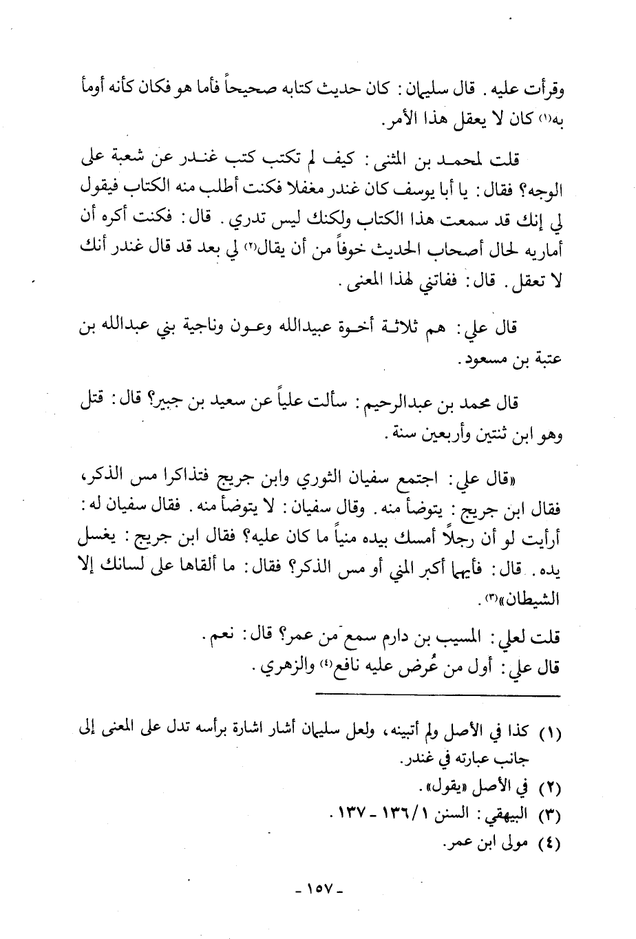 قُلْتُ لِمُحَمَّدِ بْنِ الْمُثَنَّى: كَيْفَ لَمْ تَكْتُبْ كُتُبَ غُنْدَرٍ عَنْ شُعْبَةَ عَلَى الْوَجْهِ؟ فَقَالَ: يَا أَبَا يُوسُفَ كَانَ غُنْدَرٌ مُغفَّلًا فَكُنْتُ أَطْلُبُ مِنْهُ الْكِتَابَ فَيَقُولُ لِي إِنَّكَ قَدْ سَمِعْتَ هَذَا الْكِتَابَ وَلَكِنَّكَ لَيْسَ تَدْرِي. قَالَ: فَكُنْتُ أَكْرَهُ أَنْ أُمَارِيَهُ لِحَالِ أَصْحَابِ الْحَدِيثِ خَوْفًا مِنْ أَنْ يُقَالَ [2] لِي بَعْدُ قَدْ قَالَ غُنْدَرٌ إِنَّكَ لَا تَعْقِلُ. قَالَ: فَفَاتَنِي لِهَذَا الْمَعْنَى.