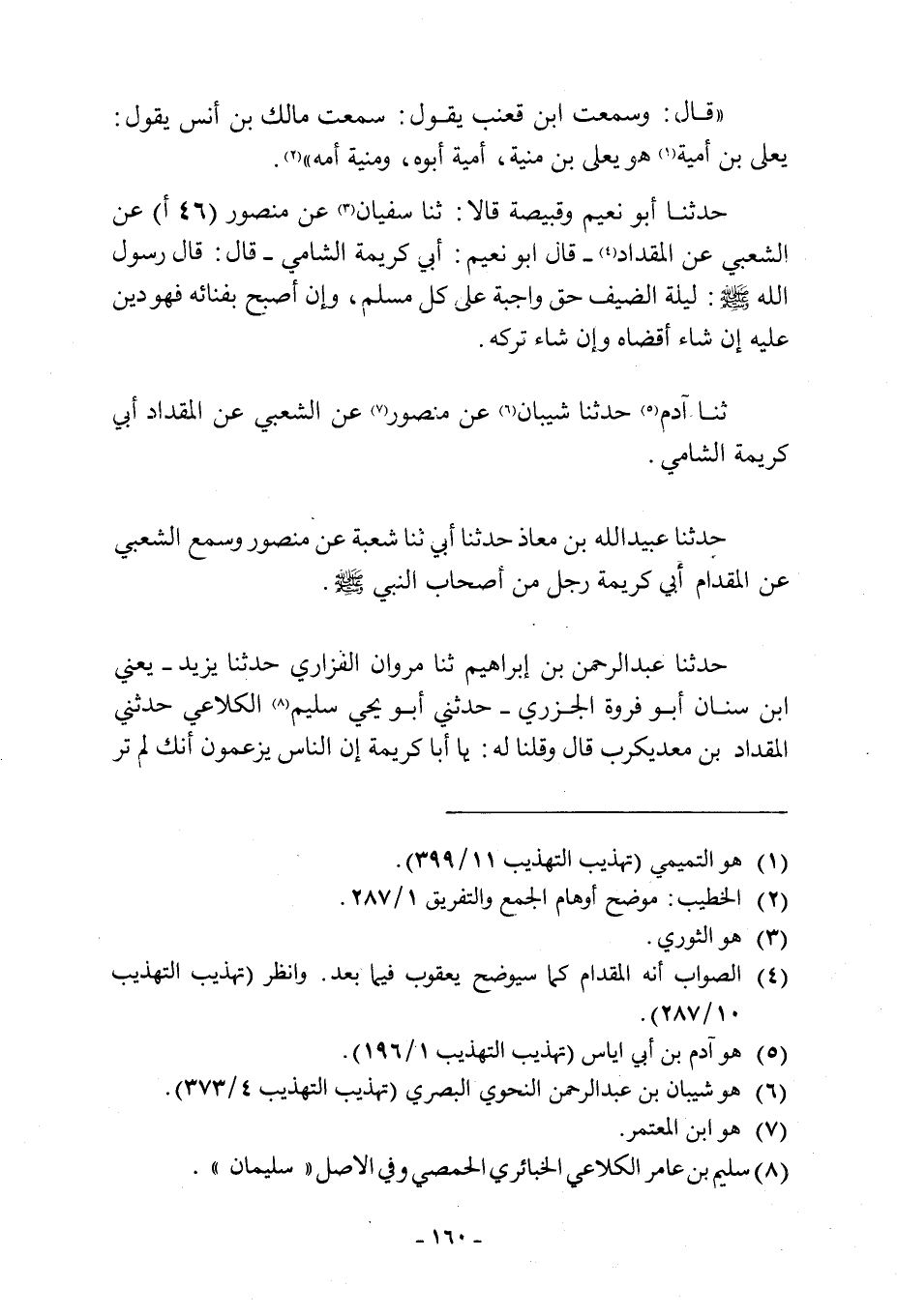 حَدَّثَنَا أبو نعيم وقبيصة قالا: ثنا سفيان [3] عن منصور (46 أ) عن الشعبي عن المقداد [4]- قال ابو نعيم: أبي كَرِيمَةَ الشَّامِيُّ- قَالَ: قَالَ رَسُولُ اللَّهِ صَلَّى اللَّهُ عَلَيْهِ وَسَلَّمَ: لَيْلَةُ الضَّيْفِ حَقٌّ وَاجِبَةٌ عَلَى كُلِّ مُسْلِمٍ، وَإِنْ أَصْبَحَ بِفِنَائِهِ فَهُوَ دين عليه ان شاء أقضاه وَإِنْ شَاءَ تَرَكَهُ. ثَنَا آدَمُ [5] حَدَّثَنَا شَيْبَانُ [6] عَنْ مَنْصُورٍ [7] عَنِ الشَّعْبِيِّ عَنِ الْمِقْدَادِ أَبِي كَرِيمَةَ الشَّامِيِّ.