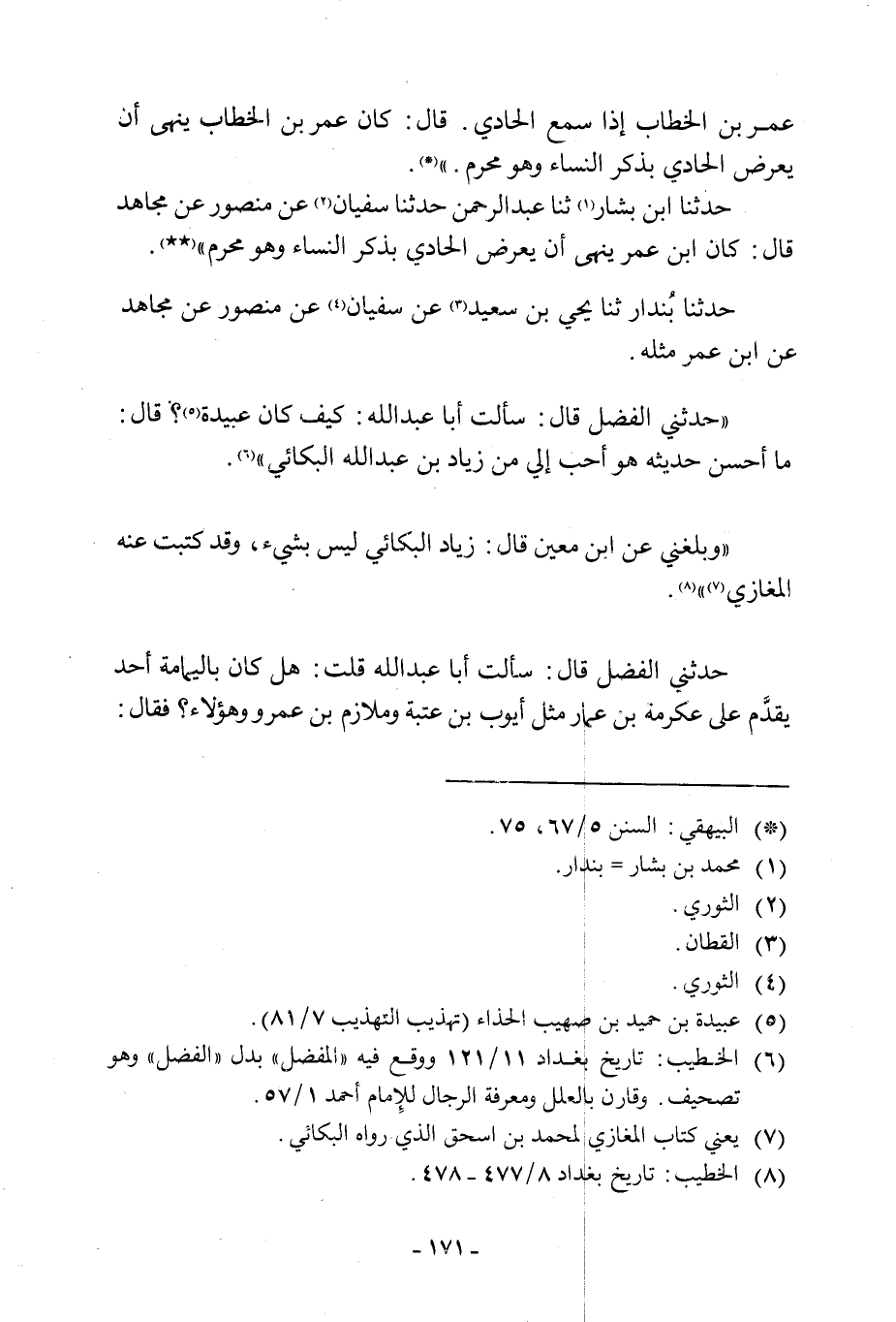 [6] الخطيب: تاريخ بغداد 11/ 121 ووقع فيه «المفضل» بدل «الفضل» وهو تصحيف. وقارن بالعلل ومعرفة الرجال للإمام احمد 1/ 57.