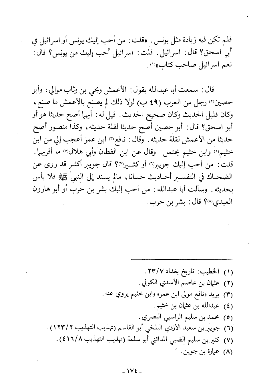 قَالَ: سَمِعْتُ أَبَا عَبْدِ الله يقول: الأعمش ويحي بن وثاب موالي، وابو حصين [2] رجل من العرب (49 ب) لولا ذلك لم يصنع بالأعمش ما صنع، وكان قليل الحديث وكان صحيح الحديث. قيل له: أيهما أصح حديثا هو أو أبو إسحاق؟ قَالَ: أَبُو حُصَيْنٍ أَصَحُّ حَدِيثًا لِقِلَّةِ حَدِيثِهِ، وَكَذا مَنْصُورٌ أَصَحُّ حَدِيثًا مِنَ الْأَعْمَشِ لِقِلَّةِ حَدِيثِهِ. وَقَالَ: نَافِعُ [3] ابْنُ عُمَرَ أَعْجَبُ إِلَيَّ مِنِ ابْنِ خُثَيْمٍ [4] وَابْنُ خُثَيْمٍ يُحْتَمَلُ. وَقَالَ عَنِ ابْنِ الْقَطَّانِ وَأَبي هِلَالٍ [5] مَا أَقْرَبَهُمَا. قُلْتُ: مَنْ أَحَبُّ إِلَيْكَ جُوَيْبِرُ [6] أَوْ كَثِيرٌ [7] ؟ قَالَ جُوَيْبِرٌ أَكْثَرُ قَدْ رَوَى عَنِ الضَّحَّاكِ فِي التَّفْسِيرِ أَحَادِيثَ حِسَانًا، مَا لَمْ يُسْنَدْ إِلَى النَّبِيِّ صَلَّى اللَّهُ عَلَيْهِ وَسَلَّمَ فَلَا بَأْسَ بِحَدِيثِهِ. وَسَأَلْتُ أَبَا عَبْدِ اللَّهِ: مَنْ أَحَبُّ إِلَيْكَ بِشْرُ بْنُ حَرْبٍ أَوْ أَبُو هَارُونَ الْعَبْدِيُّ [8] ؟ قَالَ: بِشْرُ بْنُ حَرْبٍ.