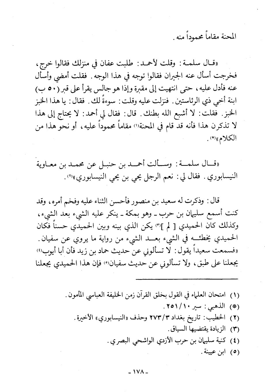 قَالَ: وَذَكَرْتُ لَهُ سَعِيدَ بْنَ مَنْصُورٍ فَأَحْسَنَ الثَّنَاءَ عَلَيْهِ وَفَخَّمَ أَمْرَهُ، وَقَدْ كُنْتُ أَسْمَعُ سُلَيْمَانَ بْنَ حَرْبٍ- وَهُوَ بِمَكَّةَ- يُنْكِرُ عَلَيْهِ الشَيْءَ بَعْدَ الشَيْءِ، وَكَذَلِكَ كَانَ الْحُمَيْدِيُّ [لَمْ] [3] يَكُنِ الَّذِي بَيْنَهُ وَبَيْنَ الْحُمَيْدِيِّ حَسَنًا فَكَانَ الْحُمَيْدِيُّ يُخَطِّئُهُ فِي الشَيْءِ بَعْدَ الشَيْءِ مِنْ رِوَايَةِ مَا يَرْوِي عَنْ سُفْيَانَ.