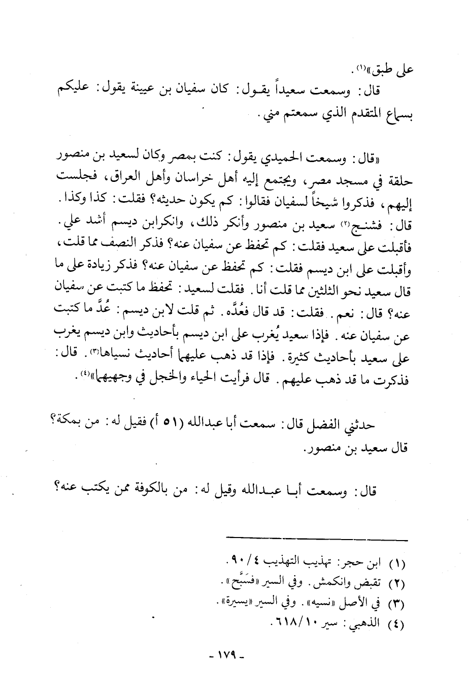 قَالَ: وَسَمِعْتُ الْحُمَيْدِيَّ يَقُولُ: كُنْتُ بِمِصْرَ وَكَانَ لِسَعِيدِ بْنِ منصور حلفة فِي مَسْجِدِ مِصْرَ، وَيَجْتَمِعُ إِلَيْهِ أَهْلُ خُرَاسَانَ وَأَهْلُ الْعِرَاقِ، فَجَلَسْتُ إِلَيْهِمْ، فَذَكَرُوا شَيْخًا لِسُفْيَانَ فَقَالُوا: كَمْ يَكُونُ حَدِيثُهُ؟ فَقُلْتُ: كَذَا وَكَذَا. قَالَ: فَشَنَّجَ [2] سَعِيدُ بْنُ مَنْصُورٍ وَأَنْكَرَ ذَلِكَ، وَأَنْكَرَ ابْنُ دَيْسَمٍ أَشَدَّ عَلَيَّ. فَأَقْبَلْتُ عَلَى سَعِيدٍ فَقُلْتُ: كَمْ تَحْفَظُ عَنْ سُفْيَانَ عَنْهُ؟ فَذَكَرَ النِّصْفَ مِمَّا قُلْتُ، وَأَقْبَلْتُ عَلَى ابْنِ دَيْسَمٍ فَقُلْتُ: كَمْ تَحْفَظُ عَنْ سُفْيَانَ عَنْهُ؟ فَذَكَرَ زِيَادَةً عَلَى مَا قَالَ سَعِيدٌ نَحْوَ الثُّلُثَيْنِ مِمَّا قُلْتُ أَنَا. فَقُلْتُ لِسَعِيدٍ: