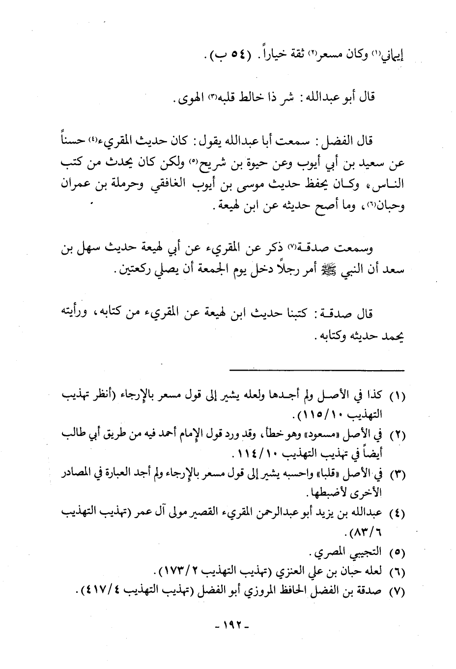 [3] في الأصل «قلبا» واحسبه يشير الى قول مسعر بالارجاء ولم أجد العبارة في المصادر الأخرى لأضبطها.