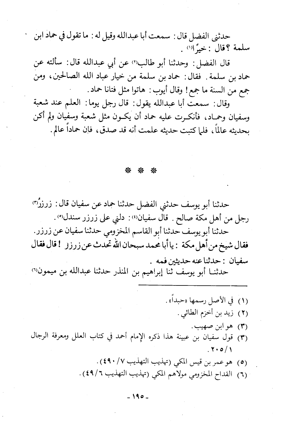 قَالَ الْفَضْلُ: وَحَدَّثَنَا أَبُو طَالِبٍ [2] عَنْ أَبِي عَبْدِ اللَّهِ قَالَ: سَأَلْتُهُ عَنْ حَمَّادِ بْنِ سَلَمَةَ. فَقَالَ: حَمَّادُ بْنُ سَلَمَةَ مِنْ خِيَارِ عِبَادِ اللَّهِ الصَّالِحِينَ، وَمَنْ جَمَعَ مِنَ السُّنَّةِ مَا جَمَعَ! وَقَالَ أَيُّوبُ: هَاتُوا مِثْلَ فَتَانَا حَمَّادٍ.