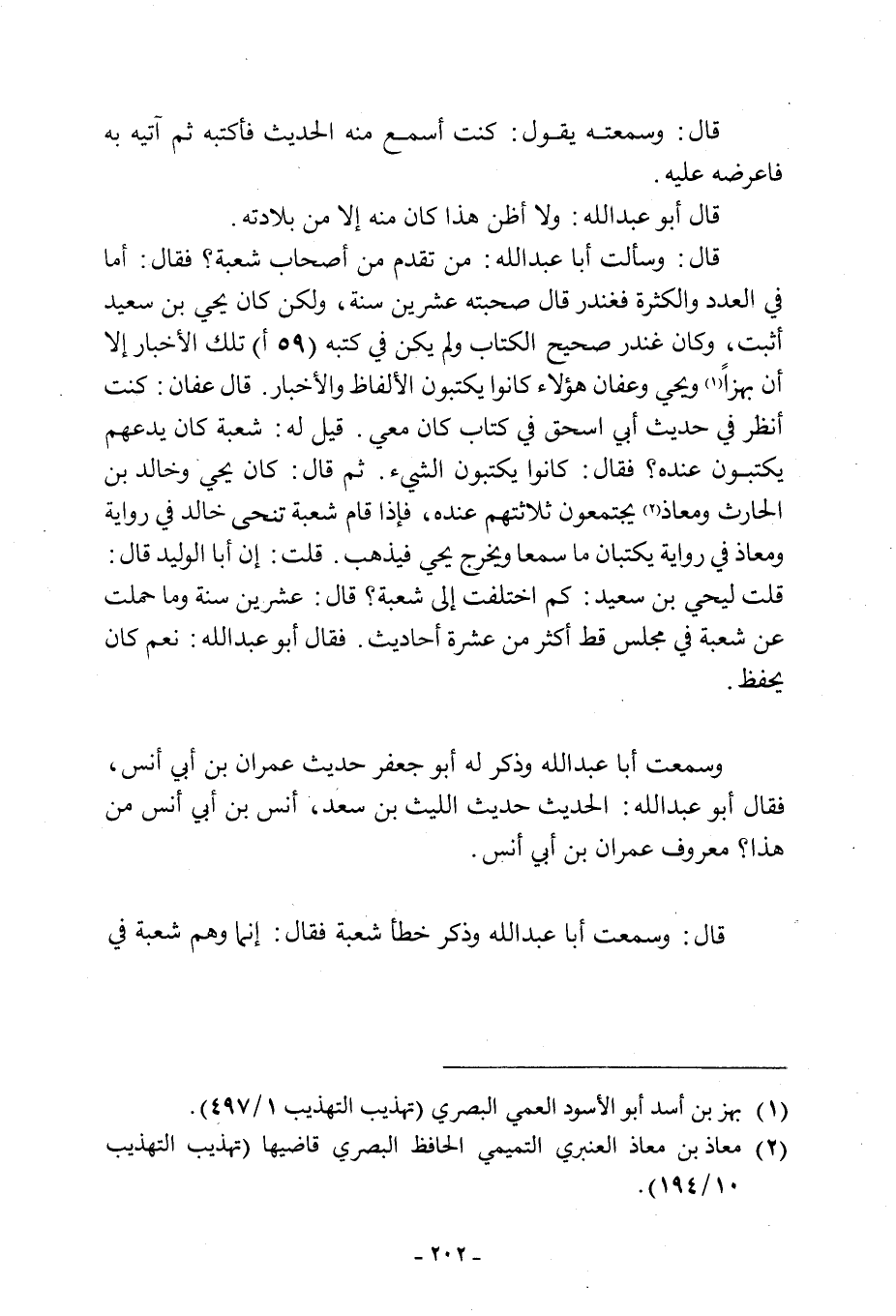 قَالَ: وَسَأَلْتُ أَبَا عَبْدِ اللَّهِ: مَنْ تُقَدِّمَ مِنْ أَصْحَابِ شُعْبَةَ؟ فَقَالَ: أَمَّا فِي الْعَدَدِ وَالْكَثْرَةِ فَغُنْدَرٌ قَالَ صحبته عشرين سنة، ولكن كان يحي بْنُ سَعِيدٍ أَثْبَتَ، وَكَانَ غُنْدَرٌ صَحِيحَ الْكِتَابِ ولم يكن في كتبه (59 أ) تلك الاخبار الا أن بهزا [1] ويحي وَعَفَّانَ هَؤُلَاءِ كَانُوا يَكْتُبُونَ الْأَلْفَاظَ وَالْأَخْبَارَ. قَالَ عفان: كنت انظر في حديث أبي إسحاق فِي كِتَابٍ كَانَ مَعِي. قِيلَ لَهُ: شُعْبَةُ كَانَ يَدْعُهُمْ يَكْتُبُونَ عِنْدَهُ؟ فَقَالَ: كَانُوا يَكْتُبُونَ الشيء. ثم قال: كان يحي وَخَالِدُ بْنُ الْحَارِثِ وَمُعَاذٌ [2] يَجْتَمِعُونَ ثَلَاثَتُهُمْ عِنْدَهُ، فَإِذَا قَامَ شُعْبَةُ تَنَحَّى خَالِدٌ فِي رِوَايَةٍ وَمُعَاذٌ فِي رِوَايَةٍ يَكْتُبَانِ مَا سَمِعَا وَيَخْرُجُ يحي فَيَذْهَبُ. قُلْتُ: إِنَّ أَبَا الْوَلِيدِ قَالَ: قُلْتُ لِيَحْيَى بْنِ سَعِيدٍ: