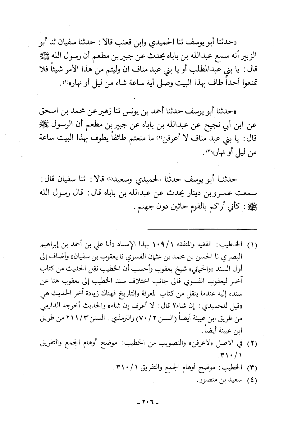 «حَدَّثَنَا أَبُو يُوسُفَ ثَنَا الْحُمَيْدِيُّ وَابْنُ قَعْنَبٍ قَالا: حَدَّثَنَا سُفْيَانُ ثَنَا أَبُو الزُّبَيْرِ أَنَّهُ سَمِعَ عَبْدَ اللَّهِ بْنَ بَابَاهْ يُحَدِّثُ عَنْ جبير بن مطعم أن رسول الله صلى اللَّهُ عَلَيْهِ وَسَلَّمَ قَالَ: يَا بَنِي عَبْدِ الْمُطَّلِبِ أَوْ يَا بَنِي عَبْدِ مَنَافٍ إِنْ وُلِّيتُمْ مِنْ هَذَا الْأَمْرِ شَيْئًا فَلَا تَمْنَعُوا أَحَدًا طَافَ بِهَذَا الْبَيْتِ وَصَلَّى أَيَةَ سَاعَةٍ شَاءَ مِنْ لَيْلٍ أَوْ نَهَارٍ» [1] . «حَدَّثَنَا أَبُو يُوسُفَ حَدَّثَنَا أَحْمَدُ بْنُ يُونُسَ ثَنَا زُهَيْرٌ عن محمد بن سحق عَنِ ابْنِ أَبِي نَجِيحٍ عَنْ عَبْدِ اللَّهِ بْنِ بَابَاهْ عَنْ جُبَيْرِ بْنِ مُطْعِمٍ أَنّ الرسول صَلَّى اللَّهُ عَلَيْهِ وَسَلَّمَ قَالَ: يَا بَنِي عَبْدِ مَنَافٍ لَا أَعْرِفَنَّ [2] مَا مَنَعْتُمْ طَائِفًا يَطُوفُ بِهَذَا الْبَيْتِ سَاعَةً مِنْ لَيْلٍ أَوْ نَهَارٍ» [3] . حَدَّثَنَا أَبُو يُوسُفَ حَدَّثَنَا الْحُمَيْدِيُّ وَسَعِيدٌ [4] قَالا: ثَنَا سُفْيَانُ قَالَ: