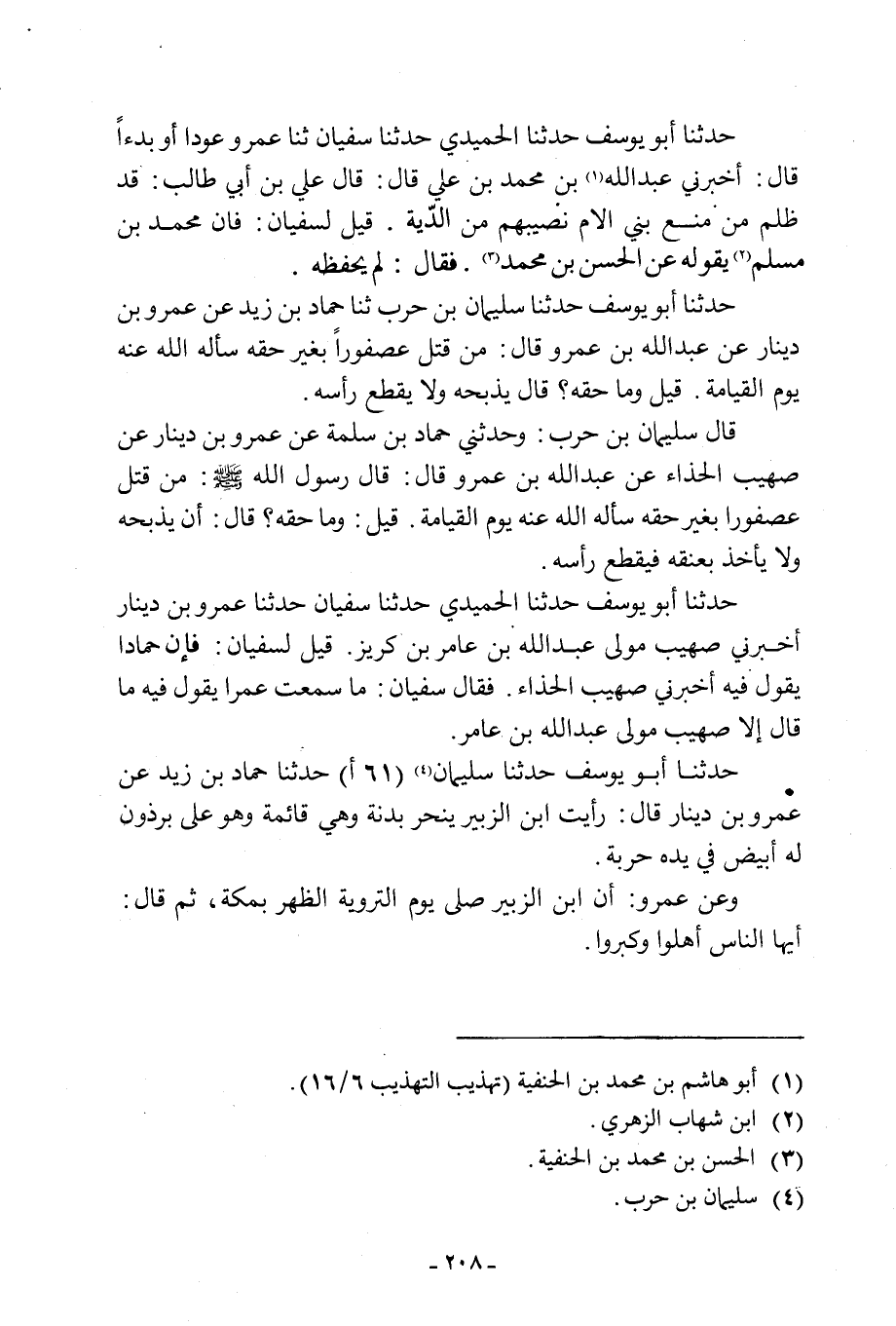 حَدَّثَنَا أَبُو يُوسُفَ حَدَّثَنَا سُلَيْمَانُ [4] (61 أ) حدثنا حماد بن زيد عن عمرو ابن دِينَارٍ قَالَ: رَأَيْتُ ابْنَ الزُّبَيْرِ يَنْحَرُ بَدَنَةً وَهِيَ قَائِمَةٌ وَهُوَ عَلَى بِرْذَوْنٍ لَهُ أَبْيَضَ فِي يَدِهِ حَرْبَةٌ.