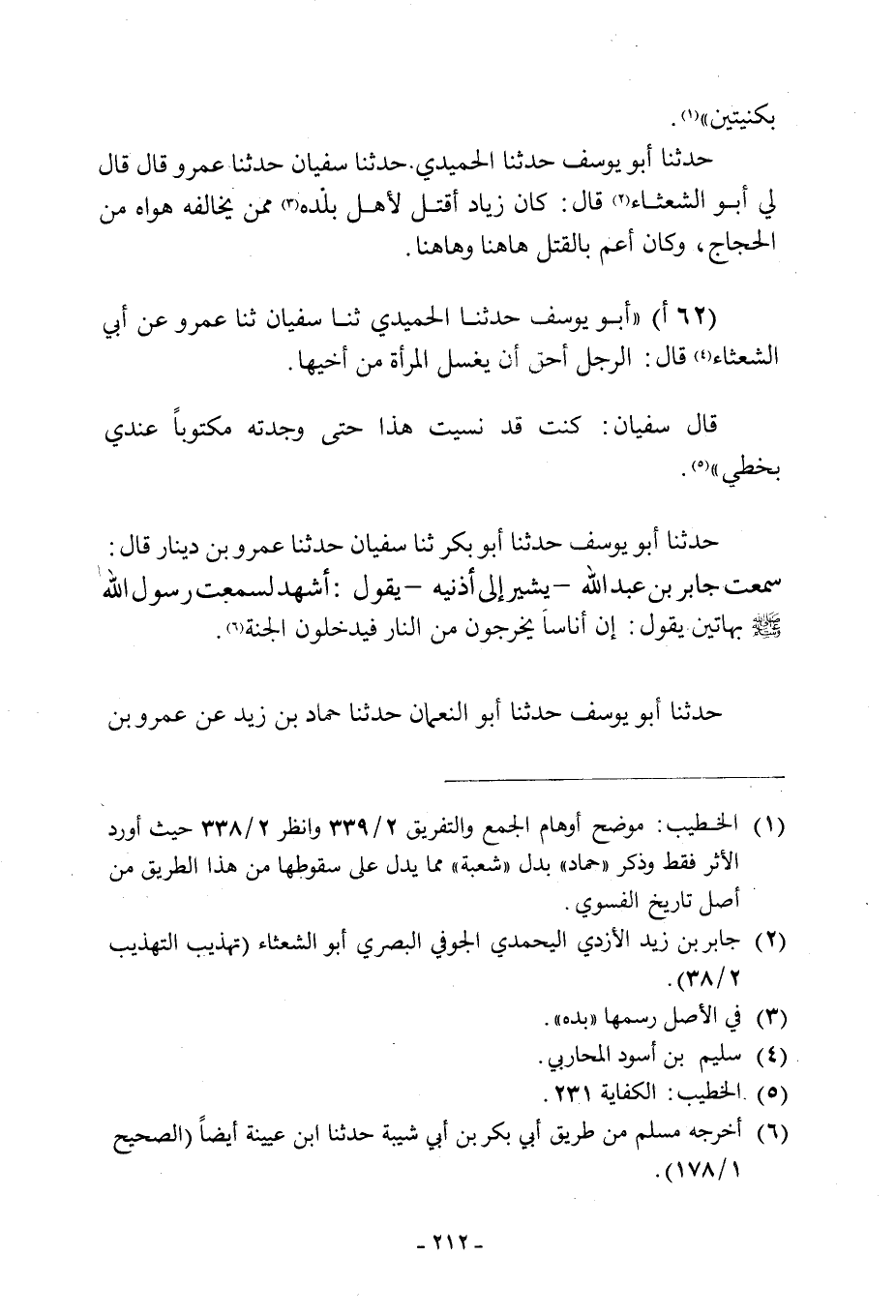 حَدَّثَنَا أَبُو يُوسُفَ حَدَّثَنَا أَبُو بكر ثنا سفيان حدثنا عمرو بن دينار قَالَ: سَمِعْتُ جَابِرَ بْنَ عَبْدِ اللَّهِ- يُشِيرُ الى أذانه- يَقُولُ: أَشْهَدُ لَسَمِعْتُ رَسُولَ اللَّهِ صَلَّى اللَّهُ عَلَيْهِ وَسَلَّمَ بِهَاتَيْنِ يَقُولُ: إِنَّ أُنَاسًا يَخْرُجُونَ مِنَ النَّارِ فَيَدْخُلُونَ الْجَنَّةَ [6] . حَدَّثَنَا أَبُو يُوسُفَ حَدَّثَنَا أَبُو النُّعْمَانِ حَدَّثَنَا حَمَّادُ بْنُ زَيْدٍ عن عمرو بن