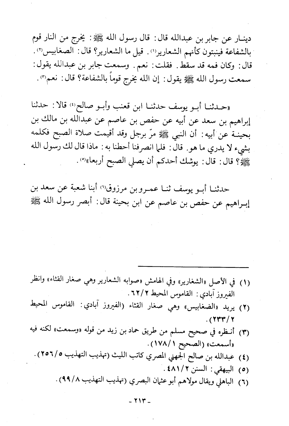 نَعَمْ. وَسَمِعْتُ جَابِرَ بْنَ عَبْدِ اللَّهِ يَقُولُ: سَمِعْتُ رسول الله صلى الله عليه وسلم يقول: إِنَّ اللَّهَ يُخْرِجُ قَوْمًا بِالشَّفَاعَةِ؟ قَالَ: نَعَمْ [3] . حَدَّثَنَا أَبُو يُوسُف حَدَّثَنَا ابْنُ قَعْنَبٍ وَأَبُو صَالِحٍ [4] قَالا: حَدَّثَنَا إِبْرَاهِيمُ بْنُ سَعْدٍ عَنْ أَبِيهِ عَنْ حَفْصِ بْنِ عَاصِمٍ عَنْ عَبْدِ اللَّهِ بْنِ مَالِكِ بْنِ بُحَيْنَةَ عَنْ أَبِيهِ: أن النبي صلى الله عليه وسلم مر بِرَجُلٍ وَقَدْ أُقِيمَتْ صَلَاةُ الصُّبْحِ فَكَلَّمَهُ بِشَيْءٍ لَا يَدْرِي مَا هُوَ. قَالَ: فَلَمَّا انْصَرَفْنَا أَحَطْنَا بِهِ: مَاذَا قَالَ لَكَ رَسُولُ اللَّهِ صَلَّى اللَّهُ عَلَيْهِ وَسَلَّمَ؟ قَالَ: قَالَ: يُوشِكُ أَحَدُكُمْ أَنْ يُصَلِّي الصُّبْحَ أَرْبعًا. حَدَّثَنَا أَبُو يُوسُفَ ثَنَا عَمْرُو بْنُ مَرْزُوقٍ [5] أَنْبَأَ شُعْبَةُ عَنْ سَعْدِ بْنِ إِبْرَاهِيمَ عَنْ حَفْصِ بْنِ عَاصِمٍ عَنِ ابْنِ بُحَيْنَةَ قَالَ: أَبْصَرَ رَسُولُ الله صلى