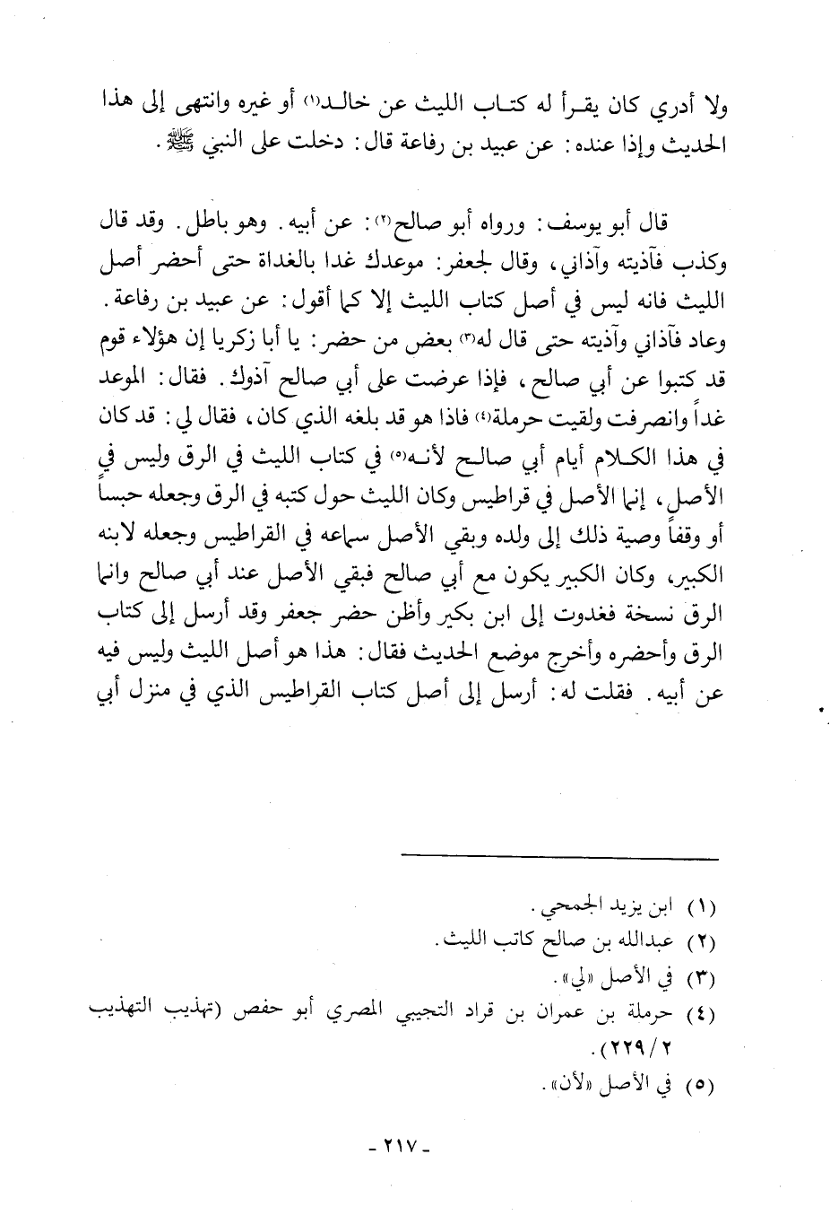 وَقَدْ قَالَ وَكَذَبَ فَآذَيْتُهُ وَآذَانِي، وَقَالَ لِجَعْفَرٍ: مَوْعِدُكَ غَدًا بِالْغَدَاةِ حَتَّى أُحْضِرَ أَصْلَ اللَّيْثِ فَإِنَّهُ لَيْسَ فِي أَصْلِ كِتَابِ اللَّيْثِ إِلَّا كَمَا أَقُولُ: عن عبيد ابن رِفَاعَةَ. وَعَادَ فَآذَانِي وَآذَيْتُهُ حَتَّى قَالَ لَهُ [3] بَعْضُ مَنْ حَضَرَ: يَا أَبَا زَكَرِيَّا إِنَّ هَؤُلَاءِ قَوْمٌ قَدْ كَتَبُوا عَنْ أَبِي صَالِحٍ، فَإِذَا عَرَّضْتَ عَلَى أَبِي صَالِحٍ آذَوْكَ. فَقَالَ: الْمَوْعِدُ غَدًا وَانْصَرَفْتُ وَلَقِيتُ حَرْمَلَةَ [4] فَإِذَا هُوَ قَدْ بَلَغَهُ الَّذِي كَانَ، فَقَالَ لِي: قَدْ كان في هذا الكلام أَيَّامِ أَبِي صَالِحٍ لِأَنَّهُ [5] فِي كِتَابِ اللَّيْثِ فِي الرَّقِّ وَلَيْسَ فِي الْأَصْلِ، إِنَّمَا الْأَصْلُ فِي قَرَاطِيسَ وَكَانَ اللَّيْثُ حَوَّلَ كُتُبَهُ فِي الرَّقِّ وَجَعَلَهُ حَبْسًا أَوْ وَقْفًا وَصِيَّةً ذَلِكَ إِلَى وَلَدِهِ وَبَقِيَ الْأَصْلُ سَمَاعُهُ فِي الْقَرَاطِيسِ وَجَعَلَهُ لِابْنِهِ الْكَبِيرِ، وَكَانَ الْكَبِيرُ يَكُونُ مَعَ أَبِي صَالِحٍ فَبَقِيَ الْأَصْلُ عِنْدَ أَبِي صَالِحٍ وَإِنَّمَا الرَّقُّ نُسْخَةٌ فَغَدَوْتُ إِلَى ابْنِ بُكَيْرٍ وَأَظُنُّ حَضَرَ جَعْفَرٌ وَقَدْ أَرْسَلَ إِلَى كِتَابِ الرَّقِّ وَأَحْضَرَهُ وَأَخْرَجَ مَوْضِعَ الْحَدِيثِ فَقَالَ: هَذَا هو أصل الليث وليس فِيهِ عَنْ أَبِيهِ. فَقُلْتُ لَهُ: