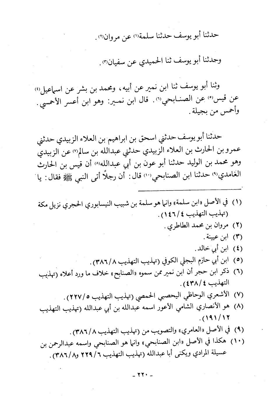 [10] هكذا في الأصل «ابن الصنابحي» وانما هو الصنابحي واسمه عبد الرحمن بن عسيلة المرادي ويكنى ابا عبد الله (تهذيب التهذيب 6/ 229 و 8/ 386) .