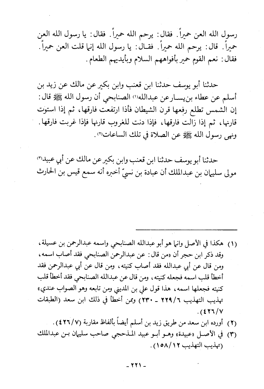 [1] هكذا في الأصل وانما هو ابو عبد الله الصنابحي واسمه عبد الرحمن بن عسيلة، وقد ذكر ابن حجر أن «من قال: عن عبد الرحمن الصنابحي فقد أصاب اسمه، ومن قال عن أبي عبد الله فقد أصاب كنيته، ومن قال عن أبي عبد الرحمن فقد اخطأ قلب اسمه فجعله كنيته، ومن قال عن عبد الله الصنابحي فقد اخطأ قلب كنيته فجعلها اسمه، هذا قول علي بن المديني ومن تابعه وهو الصواب عندي» تهذيب التهذيب 6/ 229- 230) وممن اخطأ في ذلك ابن سعد (الطبقات 7/ 426) .