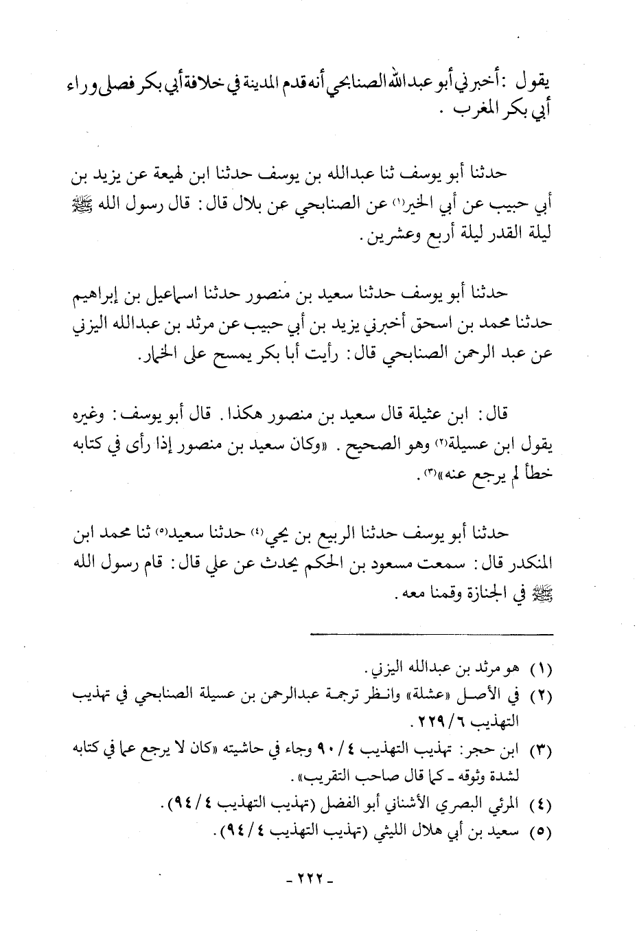 حَدَّثَنَا أَبُو يُوسُفَ ثَنَا عَبْدُ اللَّهِ بْنُ يُوسُفَ حَدَّثَنَا ابْنُ لَهِيعَةَ عَنْ يَزِيدَ بْنِ أَبِي حَبِيبٍ عَنْ أَبِي الْخَيْرِ [1] عَنِ الصُّنَابِحِيِّ عَنْ بِلَالٍ قَالَ: قَالَ رَسُولُ اللَّهِ صَلَّى اللَّهُ عَلَيْهِ وَسَلَّمَ لَيْلَةُ الْقَدْرِ لَيْلَةُ أَرْبَعٍ وَعِشْرِينَ. حَدَّثَنَا أَبُو يُوسُفَ حَدَّثَنَا سَعِيدُ بْنُ مَنْصُورٍ حَدَّثَنَا إِسْمَاعِيلُ بْنُ إِبْرَاهِيمَ حَدَّثَنَا مُحَمَّدُ بْنُ إِسْحَاقَ أَخْبَرَنِي يَزِيدُ بْنُ أَبِي حبيب عن مرثد ابن عَبْدِ اللَّهِ الْيَزَنِيِّ عَنْ عَبْدِ الرَّحْمَنِ الصُّنَابِحِيِّ قَالَ: رَأَيْتُ أَبَا بَكْرٍ يَمْسَحُ عَلَى الْخِمَارِ.