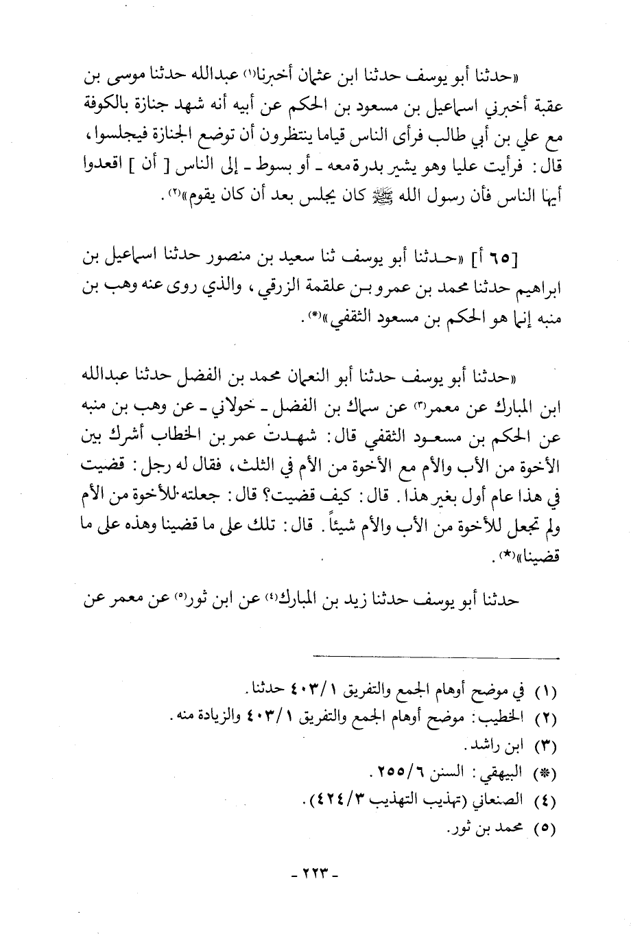 «حَدَّثَنَا أَبُو يُوسُفَ حَدَّثَنَا ابْنُ عُثْمَانَ أَخْبَرَنَا [1] عبد الله حدثنا موسى بن عقبة أخبرني إِسْمَاعِيلُ بْنُ مَسْعُودِ بْنِ الْحَكَمِ عَنْ أَبِيهِ أَنَّهُ شَهِدَ جِنَازَةً بِالْكُوفَةِ مَعَ عَلِيِّ بْنِ أَبِي طَالِبٍ فَرَأَى النَّاسَ قِيَامًا يَنْتَظِرُونَ أَنْ تُوضَعَ الْجِنَازَةَ فَيَجْلِسُوا، قَالَ: فَرَأَيْتُ عَلِيًّا وَهُوَ يُشِيرُ بِدِرَّةٍ مَعَهُ- أَوْ بِسَوْطٍ- إِلَى النَّاسِ [أَنِ] اقْعُدُوا أَيُّهَا النَّاسُ فَإِنَّ رَسُولَ اللَّهِ صَلَّى اللَّهُ عَلَيْهِ وَسَلَّمَ كَانَ يَجْلِسُ بَعْدَ أن كان يقوم» [2] . [65 أ] حَدَّثَنَا أَبُو يُوسُفَ ثَنَا سَعِيدُ بْنُ مَنْصُورٍ حَدَّثَنَا إِسْمَاعِيلُ بْنُ إِبْرَاهِيمَ حَدَّثَنَا مُحَمَّدُ بْنُ عَمْرِو بْنِ عَلْقَمَةَ الزُّرَقِيُّ، وَالَّذِي رَوَى عَنْهُ وهب ابن مُنَبِّهٍ إِنَّمَا هُوَ الْحَكَمُ بْنُ مَسْعُودٍ الثَّقَفِيُّ.