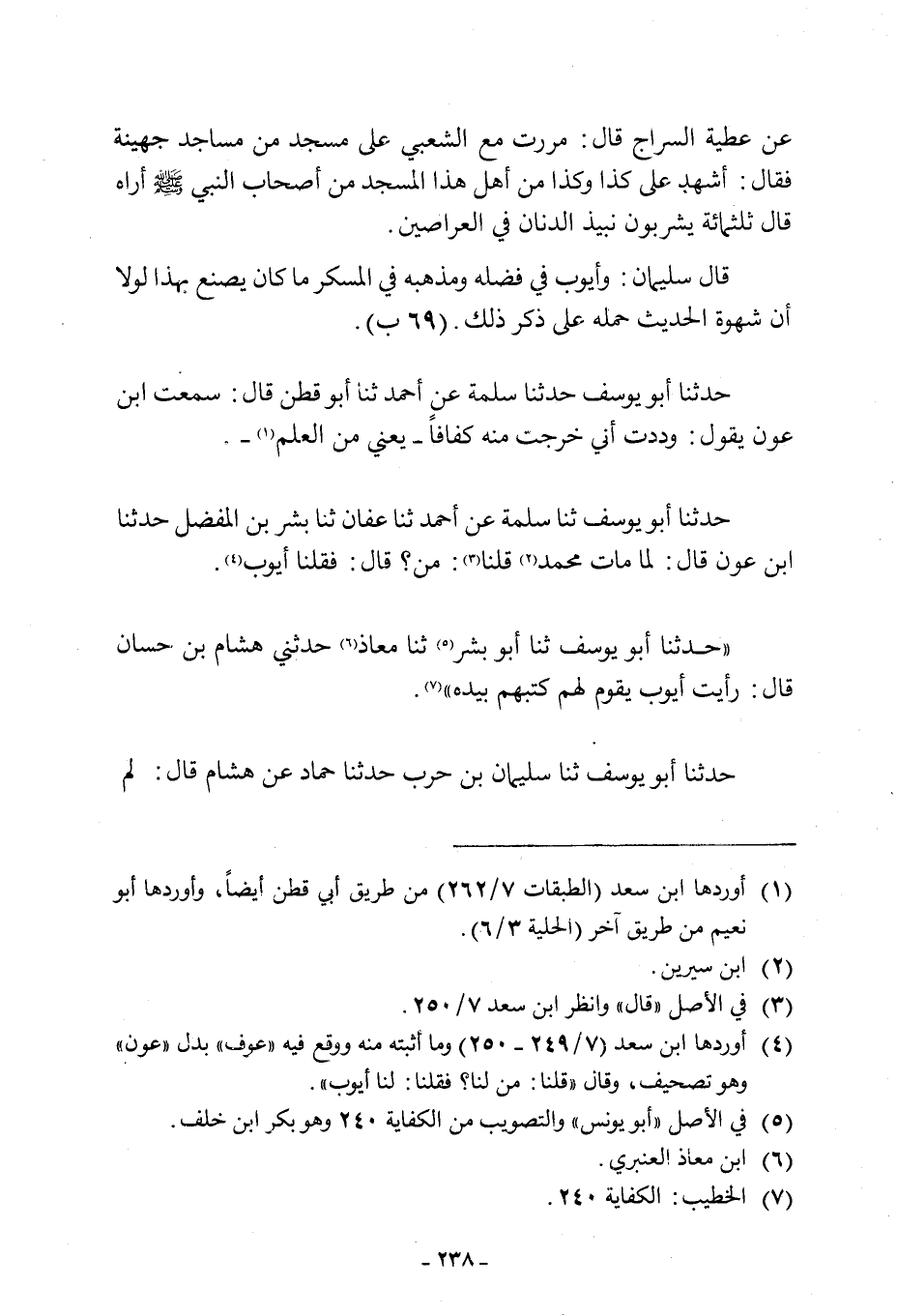 «حَدَّثَنَا أَبُو يُوسُفَ ثَنَا أَبُو بِشْرٍ [5] ثَنَا مُعَاذٌ [6] حدَّثَنِي هِشَامُ بْنُ حَسَّانٍ قَالَ: رَأَيْتُ أَيُّوبَ يُقَوِّمُ لَهُمْ كتبهم بيده» [7] .