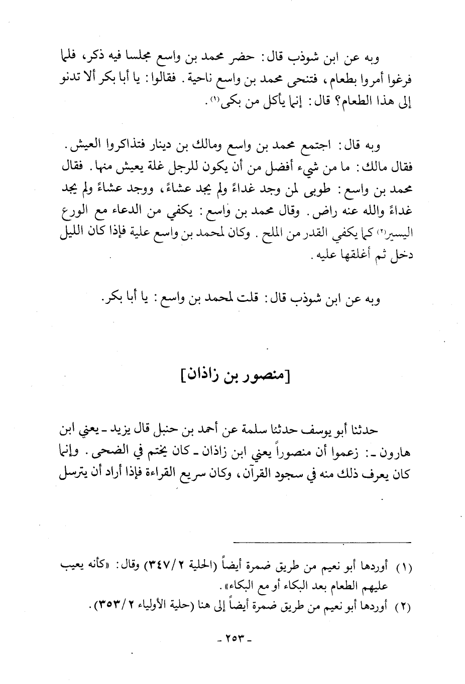 حَدَّثَنَا أَبُو يُوسُفَ حَدَّثَنَا سَلَمَةُ عَنْ أَحْمَدَ بْنِ حَنْبَلٍ قَالَ يَزِيدُ- يَعْنِي ابْنَ هَارُونَ-: زَعَمُوا أَنَّ مَنْصُورًا كَانَ- يَعْنِي ابْنَ زَاذَانَ- كَانَ يَخْتِمُ فِي الضُّحَى. وَإِنَّمَا كَانَ يُعْرَفُ ذَلِكَ مِنْهُ فِي سُجُودِ الْقُرْآنِ، وَكَانَ سَرِيعَ الْقِرَاءَةِ فَإِذَا أَرَادَ أَنْ يترسل فكان لا يستطيع فأرسل