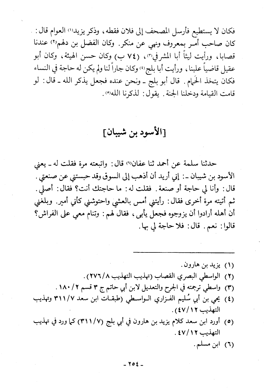 حَدَّثَنَا سَلَمَةُ عَنْ أَحْمَدَ وَثَنَا عَفَّانُ [6] قَالَ: وَاتَّبَعْتُهُ مَرَّةً فَقُلْتُ لَهُ- يَعْنِي الْأَسْوَدَ بْنَ شَيْبَانَ-: إِنِّي أُرِيدُ أَنْ أَذْهَبَ إِلَى السُّوقِ وَقَدْ حَبَسْتَنِي عَنْ صَنْعَتِي. قَالَ: وَأَنَا لِي حَاجَةٌ أَوْ صَنعَةٌ. فَقُلْتُ لَهُ: مَا حَاجَتُكَ أَنْتَ؟