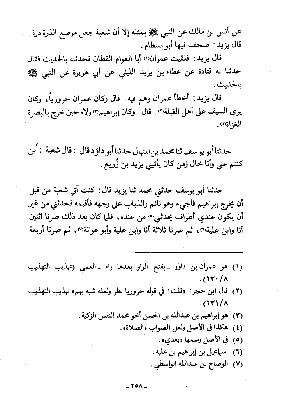 حَدَّثَنَا أَبُو يُوسُفَ حَدَّثَنِي مُحَمَّدُ ثَنَا يَزِيدُ قَالَ: كُنْتُ آتِي شُعْبَةَ مِنْ قَبْلِ أَنْ يَخْرُجَ إِبْرَاهِيمُ فَأَجِيءُ وَهُوَ نَائِمٌ وَالذُّبَابُ عَلَى وَجْهِهِ فَأُقِيمُهُ فَحَدَّثَنِي مِنْ غَيْرِ أَنْ يَكُونَ عِنْدِي أَطْرَافٌ يُحَدِّثُنِي [5] مِنْ عِنْدِهِ، فَلَمَّا كَانَ بَعْدَ ذَلِكَ صِرْنَا اثْنَيْنِ أَنَا وَابْنُ عُلَيَّةَ [6] ، ثُمَّ صِرْنَا ثَلَاثَةً أَنَا وابن علية وابو عوانة [7] ،