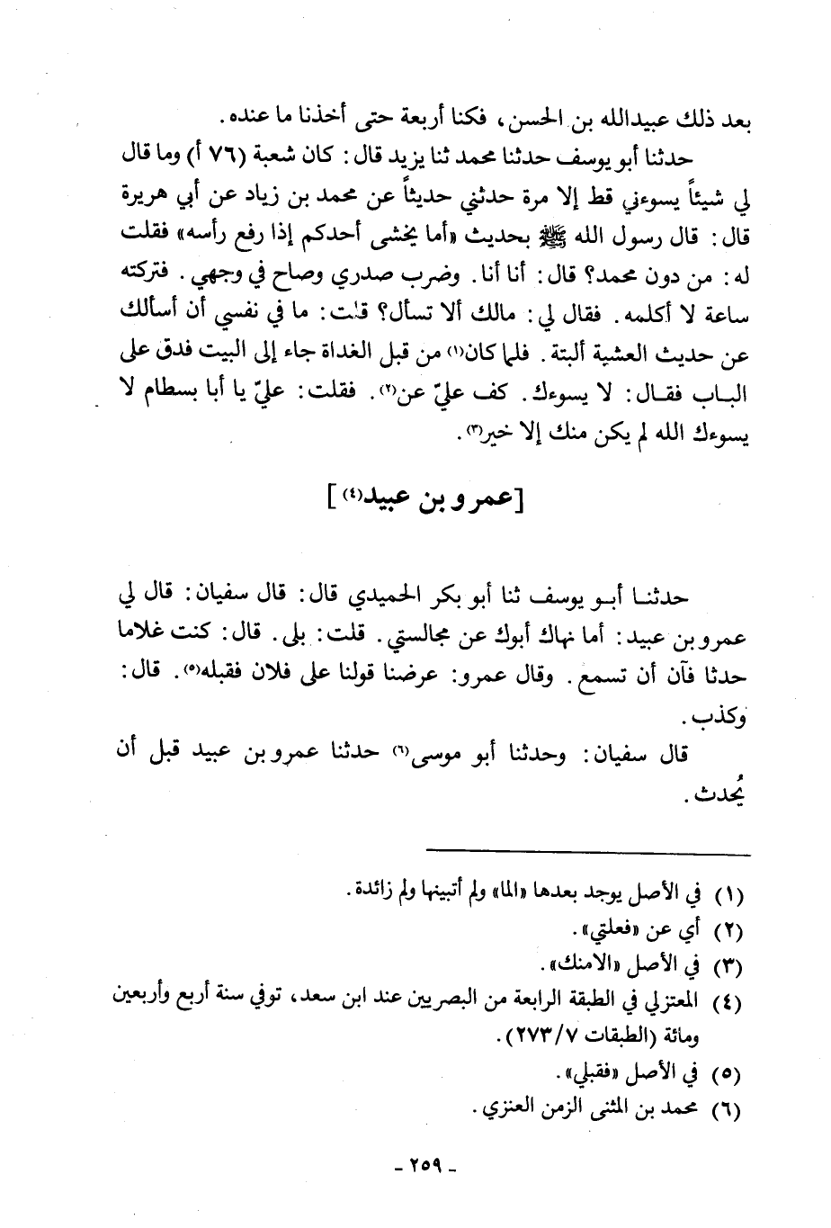 [4] حَدَّثَنَا أَبُو يُوسُفَ ثَنَا أَبُو بَكْرٍ الْحُمَيْدِيُّ قَالَ: قَالَ سُفْيَانُ: قَالَ لِي عَمْرُو بْنُ عُبَيْدٍ: أَمَا نَهَاكَ أَبُوكَ عَنْ مُجَالَسَتِي. قُلْتُ: بَلَى. قَالَ: كُنْتَ غُلَامًا حَدَثًا فَآنَ أَنْ تَسْمَعَ. وَقَالَ عَمْرٌو: عَرَضْنَا قَوْلَنَا عَلَى فُلَانٍ فَقَبِلَهُ [5] . قَالَ: