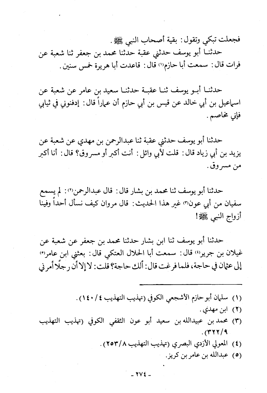 لَمْ يَسْمَعْ سُفْيَانُ مِنْ أَبِي عَوْنٍ [3] غَيْرَ هَذَا الْحَدِيثِ: قَالَ مَرْوَانُ كَيْفَ نَسْأَلُ أَحَدًا وَفِينَا أَزْوَاجُ النَّبِيِّ صَلَّى اللَّهُ عَلَيْهِ وَسَلَّمَ! حَدَّثَنَا أَبُو يُوسُفَ ثَنَا ابْنُ بَشَّارٍ حَدَّثَنَا مُحَمَّدُ بْنُ جَعْفَرٍ عَنْ شُعْبَةَ عَنْ غَيْلَانَ بن جرير [4] قال: سمعت أبا الحلال العتكي قَالَ: بَعَثَنِي ابْنُ عَامِرٍ [5] إِلَى عُثْمَانَ فِي حَاجَةٍ، فَمَا فَرَغْتُ قَالَ: أَلَكَ حَاجَةٌ؟ قُلْتُ: لا الا