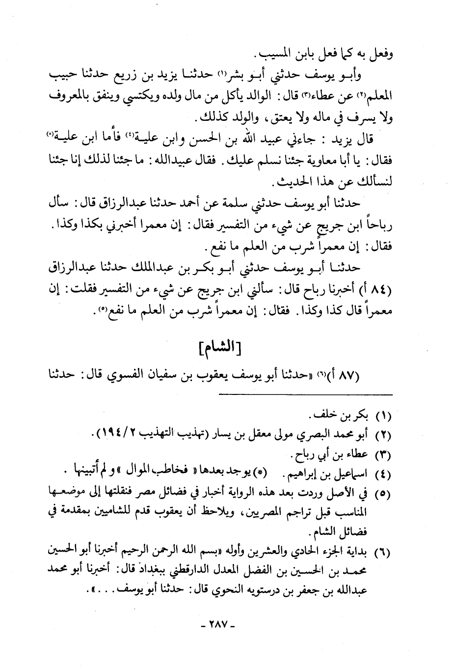 (87 أ) [6] «حَدَّثَنَا أَبُو يُوسُفَ يَعْقُوبُ بْنُ سُفْيَانَ الْفَسَوِيُّ قال:
