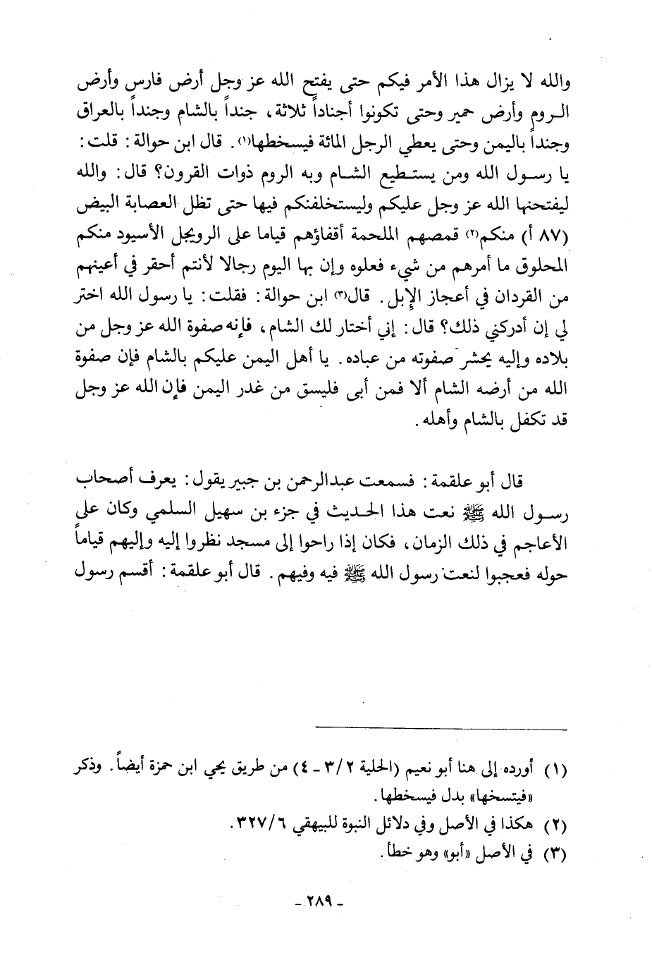 فِيكُمْ حَتَّى يَفْتَحِ اللَّهُ عَزَّ وَجَلَّ أَرْضَ فَارِسٍ وَأَرْضَ الرُّومِ وَأَرْضَ حِمْيَرَ وَحَتَّى تَكُونُوا أَجْنَادًا ثَلَاثَةً، جُنْدًا بِالشَّامِ وَجُنْدًا بِالْعِرَاقِ وَجُنْدًا بِالْيَمَنِ وَحَتَّى يُعْطَى الرَّجُلُ الْمِائَةَ فَيَسْخَطَهَا [1] . قَالَ ابْنُ حَوَالَةَ: قُلْتُ: يَا رَسُولَ اللَّهِ وَمَنْ يَسْتَطِيعُ الشَّامَ وَبِهِ الرُّومُ ذَوَاتُ الْقُرُونِ؟ قَالَ: والله ليفتحنها الله عز وجل عليكم وليستخلفنكم فيها حتى تظل العصابة البيض (87 ب) مِنْهُمْ [2] قُمُصُهُمُ الْمُلَحَّمَةُ أَقْفَاؤُهُمْ قِيَامًا عَلَى الرُّوَيْجِلِ الْأُسَيْوِدِ مِنْكُمُ الْمَحْلُوقِ مَا أَمَرَهُمْ مِنْ شَيْءٍ فَعَلُوهُ وَإِنَّ بِهَا الْيَوْمَ رِجَالًا لَأَنْتُمْ أَحْقَرُ فِي أَعْيُنِهِمْ مِنَ الْقُرْدَانِ فِي أَعْجَازِ الْإِبِلِ. قَالَ [3] ابْنُ حَوَالَةَ: فَقُلْتُ: يَا رَسُولَ اللَّهِ اخْتَرْ لِي إِنْ أَدْرَكَنِي ذَلِكَ؟ قَالَ: إِنِّي أَخْتَارُ لَكَ الشَّامَ، فَإِنَّهُ صَفْوَةُ اللَّهِ عَزَّ وَجَلَّ مِنْ بِلَادِهِ وَإِلَيْهِ يُحْشَرُ صَفْوَتُهُ مِنْ عِبَادِهِ. يَا أَهْلَ الْيَمَنِ عَلَيْكُمْ بِالشَّامِ فَإِنَّ صَفْوَةَ اللَّهِ مِنْ أَرْضِهِ الشَّامُ أَلَا فَمَنْ أَبَى فَلْيُسْقَ مِنْ غُدُرِ الْيَمَنِ فَإِنَّ اللَّهَ عَزَّ وَجَلَّ قَدْ تَكَفَّلَ بِالشَّامِ وَأَهْلِهِ. قَالَ أَبُو عَلْقَمَةَ: فَسَمِعْتُ عَبْدَ الرَّحْمَنِ بْنَ جُبَيْرٍ يَقُولُ: يَعْرِفُ أَصْحَابُ رَسُولِ اللَّهِ صَلَّى اللَّهُ عَلَيْهِ وَسَلَّمَ نَعْتَ هَذَا الْحَدِيثِ فِي جُزْءِ بْنِ سُهَيْلٍ السُّلَمِيِّ وَكَانَ عَلَى الْأَعَاجِمِ فِي ذَلِكَ الزَّمَانِ، فَكَانَ إِذَا رَاحُوا إِلَى مَسْجِدٍ نظروا اليه واليهم قياما حوله فَعَجِبُوا لِنَعْتِ رَسُولِ اللَّهِ صَلَّى اللَّهُ عَلَيْهِ وَسَلَّمَ فِيهِ وَفِيهِمْ.