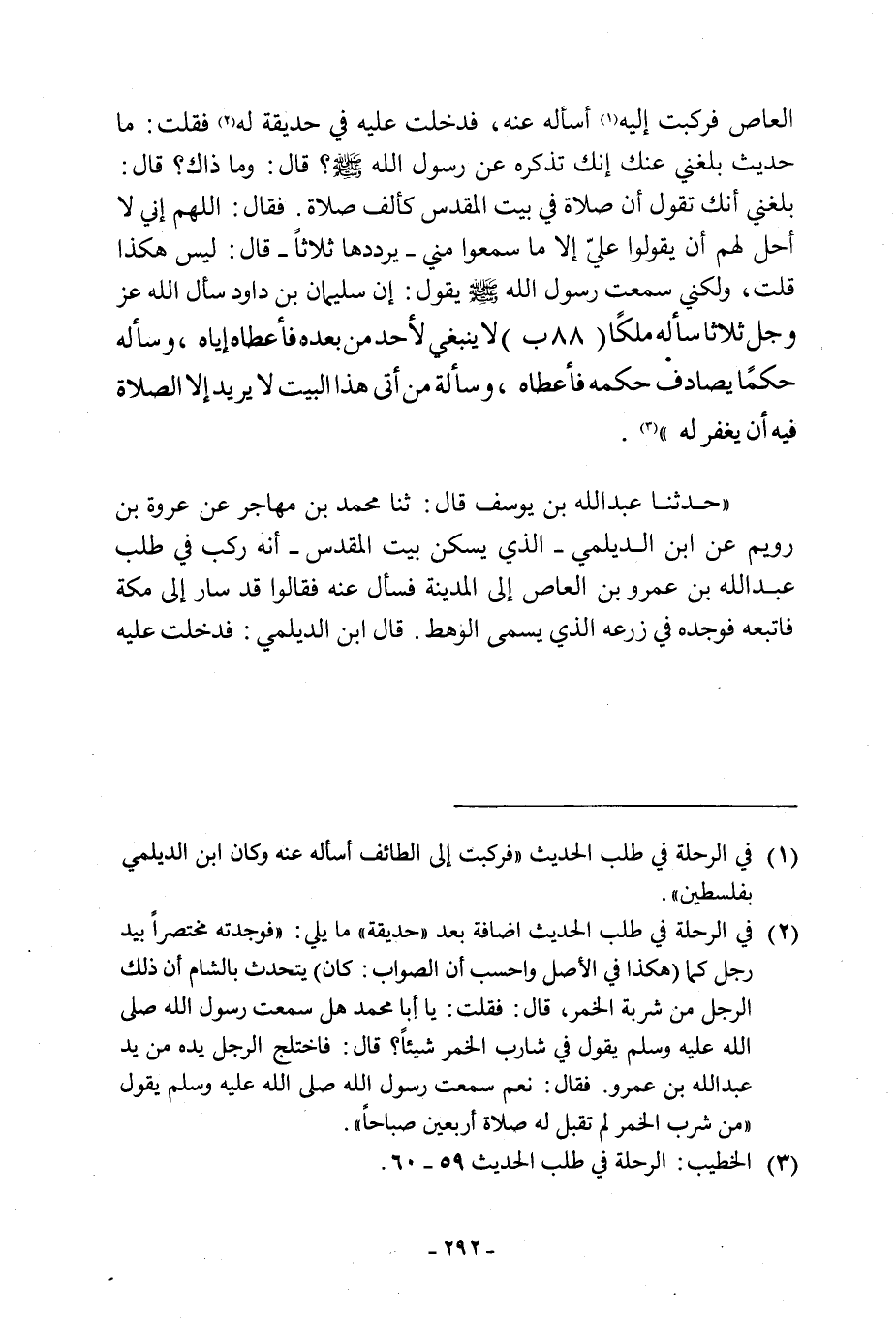 قَالَ: وَمَا ذَاكَ؟ قَالَ: بَلَغَنِي أَنَّكَ تَقُولُ أَنَّ صَلَاةً فِي بَيْتِ الْمَقْدِسِ كَأَلْفِ صَلَاةٍ. فَقَالَ: اللَّهمّ إِنِّي لَا أُحِلُّ لَهُمْ أَنْ يَقُولُوا عَلَيَّ إِلَّا مَا سَمِعُوا مِنِّي- يُرَدِّدُهَا ثَلَاثًا- قَالَ: لَيْسَ هَكَذَا قلت، ولكني سمعت رسول الله صلى صَلَّى اللَّهُ عَلَيْهِ وَسَلَّمَ يَقُولُ: إِنَّ سُلَيْمَانَ بْنَ دَاوُدَ سَأَلَ اللَّهَ عَزَّ وجَلَّ ثَلَاثًا سأله ملكا (88 ب) لَا يَنْبَغِي لِأَحَدٍ مِنْ بَعْدِهِ فَأَعْطَاهُ، وَسَأَلَهُ حُكْمًا يُصَادِقُ حِكْمَةً فَأَعْطَاهُ، وَسَأَلَهُ مَنْ أَتَى هَذَا الْبَيْتَ لَا يُرِيدُ إِلَّا الصَّلَاةَ فِيهِ أَنْ يَغْفِرَ لَهُ» [3] . «حَدَّثَنَا عَبْدُ اللَّهِ بْنُ يُوسُفَ قَالَ: ثَنَا مُحَمَّدُ بْنُ مُهَاجِرٍ عَنْ عُرْوَةَ بْنِ رُوَيْمٍ عَنِ ابْنِ الدَّيْلَمِيِّ- الَّذِي يَسْكُنُ بَيْتَ الْمَقْدِسِ- أَنَّهُ رَكِبَ فِي طَلَبِ عَبْدِ اللَّهِ بْنِ عَمْرِو بْنِ الْعَاصِ إِلَى الْمَدِينَةِ فَسَأَلَ عَنْهُ فَقَالُوا قَدْ سَارَ إِلَى مَكَّةَ فَاتَّبَعَهُ فَوَجَدَهُ فِي زَرْعِهِ الَّذِي يُسَمَّى الوهط. قال ابن الديلميّ: فدخلت