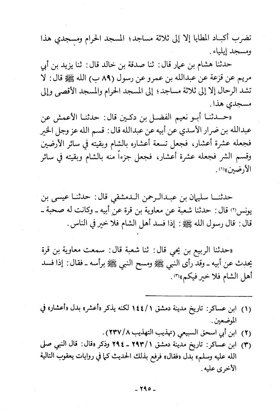 عَلَيْهِ وَسَلَّمَ يَقُولُ: لَا تُضْرَبُ أَكْبَادُ الْمَطَايَا إِلَّا إِلَى ثَلَاثَةِ مَسَاجِدٍ، الْمَسْجِدِ الْحَرَامِ وَمَسْجِدِي هَذَا وَمَسْجِدِ إِيلِيَاءَ. حَدَّثَنَا هِشَامُ بْنُ عَمَّارٍ قَالَ: ثَنَا صَدَقَةُ بْنُ خَالِدٍ قَالَ: ثَنَا يَزِيدُ بْنُ أَبِي مَرْيَمَ عَنْ قَزْعَةَ عَنْ عبد الله بن عمرو عن رسول (89 ب) اللَّهِ صَلَّى اللَّهُ عَلَيْهِ وَسَلَّمَ قَالَ: لَا تُشَدُّ الرِّحَالُ إِلَّا إِلَى ثَلَاثَةِ مَسَاجِدٍ، إِلَى الْمَسْجِدِ الْحَرَامِ وَالْمَسْجِدِ الْأَقْصَى وَإِلَى مَسْجِدِي هَذَا. «حَدَّثَنَا أَبُو نُعَيْمٍ الْفَضْلُ بْنُ دُكَيْنٍ قَالَ: حدثنا الأعمش عن عبد الله ابن ضِرَارٍ الْأَسَدِيِّ عَنْ أَبِيهِ عَنْ عَبْدِ اللَّهِ قَالَ: قَسَّمَ اللَّهُ عَزَّ وَجَلَّ الْخَيْرَ فَجَعَلَهُ عَشْرَةَ أَعْشَارٍ، فَجَعَلَ تِسْعَةَ أَعْشَارِهِ بِالشَّامِ وَبَقِيَّتَهُ في سائر الأرضين وقسم الشر فجعله عَشْرَةَ أَعْشَارٍ، فَجَعَلَ جُزْءًا مِنْهُ بِالشَّامِ وَبَقِيَّتَهُ فِي سَائِرِ الْأَرَضِينَ» [1] .