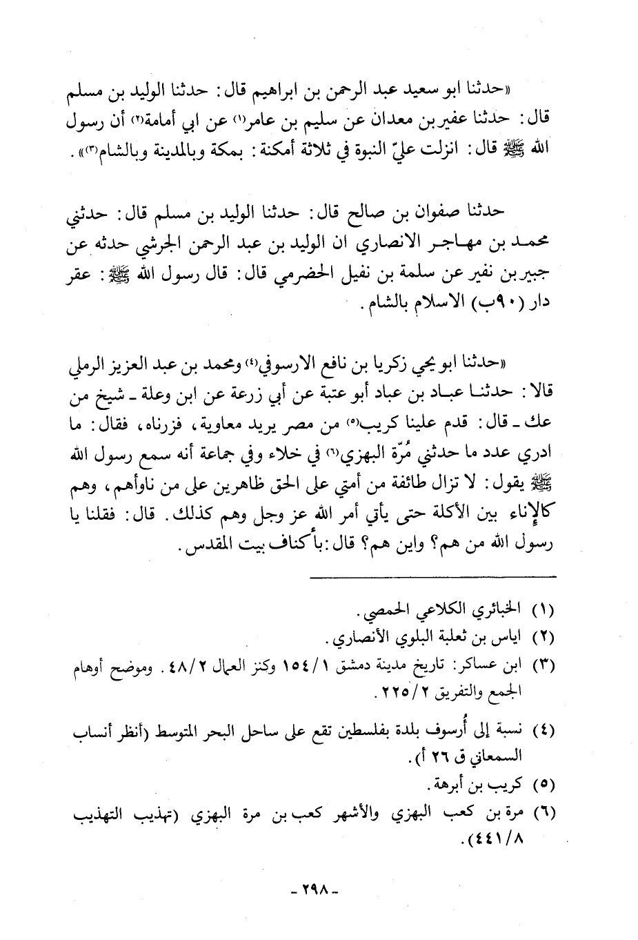 بِمَكَّةَ وَبِالْمَدِينَةِ وَبِالشَّامِ» [3] . حَدَّثَنَا صَفْوَانُ بْنُ صَالِحٍ قَالَ: حَدَّثَنَا الْوَلِيدُ بْنُ مُسْلِمٍ قَالَ: حَدَّثَنِي مُحَمَّدُ بْنُ مُهَاجِرٍ الْأَنْصَارِيُّ أَنَّ الْوَلِيدَ بْنَ عَبْدِ الرَّحْمَنِ الْجُرَشِيَّ حَدَّثَهُ عَنْ جُبَيْرِ بْنِ نُفَيْرٍ عَنْ سَلَمَةَ بْنِ نُفَيْلٍ الْحَضْرَمِيِّ قَالَ: قَالَ رَسُولُ اللَّهِ صَلَّى الله عليه وسلم: عقر دار (90 ب) الإسلام بالشام. «حدثنا ابو يحي زَكَرِيَّا بْنُ نَافِعٍ الْأُرْسُوفِيُّ [4] وَمُحَمَّدُ بْنُ عَبْدِ الْعَزِيزِ الرَّمْلِيُّ قَالا: حَدَّثَنَا عَبَّادُ بْنُ عَبَّادٍ أَبُو عُتْبَةَ عَنْ أَبِي زُرْعَةَ عَنِ ابْنِ وَعْلَةَ- شَيْخٌ مِنْ عَكَّ- قَالَ: قَدِمَ عَلَيْنَا كُرَيْبٌ [5] مِنْ مِصْرَ يُرِيدُ مُعَاوِيَةَ، فَزُرْنَاهُ، فَقَالَ: مَا أَدْرِي عَدَدَ مَا حَدَّثَنِي مُرَّةُ الْبَهْزِيُّ [6] فِي خَلَاءٍ وَفِي جَمَاعَةٍ أَنَّهُ سَمِعَ رَسُولَ اللَّهِ صَلَّى اللَّهُ عَلَيْهِ وَسَلَّمَ يَقُولُ: لَا تَزَالُ طَائِفَةٌ مِنْ أُمَّتِي عَلَى الْحَقِّ ظَاهِرِينَ عَلَى مَنْ نَاوَأَهُمْ، وَهُمْ كَالْإِنَاءِ بَيْنَ الْأَكَلَةِ حَتَّى يَأْتِيَ أَمْرُ اللَّهِ عَزَّ وَجَلَّ وَهُمْ كَذَلِكَ. قَالَ: فَقُلْنَا يَا رَسُولَ اللَّهِ مَنْ هم؟