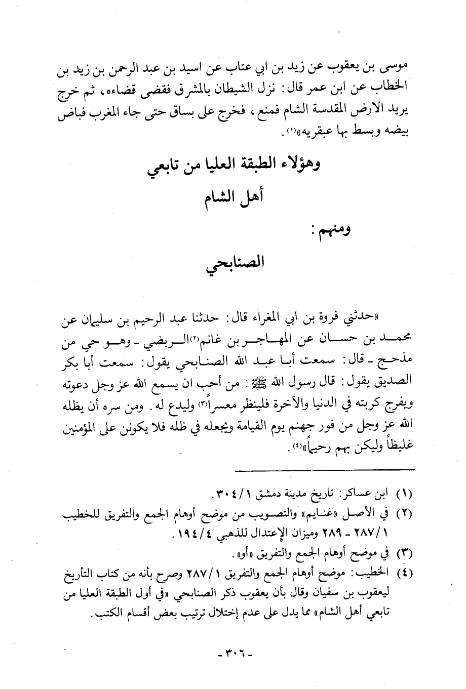 [4] الخطيب: موضح أوهام الجمع والتفريق 1/ 287 وصرح بأنه من كتاب التأريخ ليعقوب بن سفيان وقال بأن يعقوب ذكر الصنابحي «في أول الطبقة العليا من تابعي أهل الشام» مما يدل على عدم اختلال ترتيب بعض أقسام الكتاب.