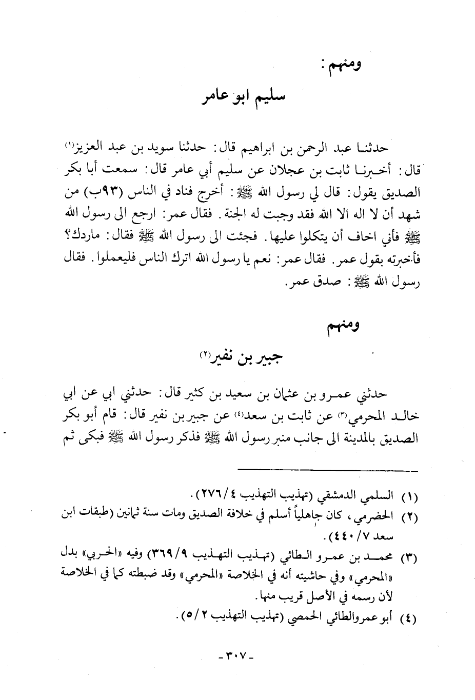 [3] محمد بن عمرو الطائي (تهذيب التهذيب 9/ 369) وفيه «الحربي» بدل «المحرمي» وفي حاشيته انه في الخلاصة «المحرمي» وقد ضبطته كما في الخلاصة لان رسمه في الأصل قريب منها.