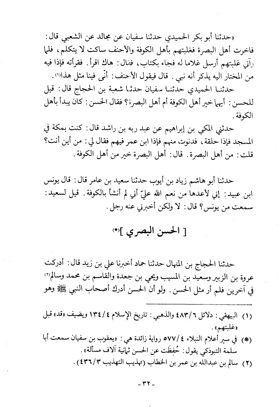 حَدَّثَنَا الْحُمَيْدِيُّ حَدَّثَنَا سُفْيَانُ حَدَّثَنَا شُعْبَةُ بْنُ الْحَجَّاجِ قَالَ: قِيلَ لِلْحَسَنِ: أَيُّهُمَا خَيْرٌ أَهْلُ الْكُوفَةِ أَمْ أَهْلُ الْبَصْرَةِ؟ فَقَالَ الْحَسَنُ: كَانَ يَبْدَأُ بِأَهْلِ الْكُوفَةِ.