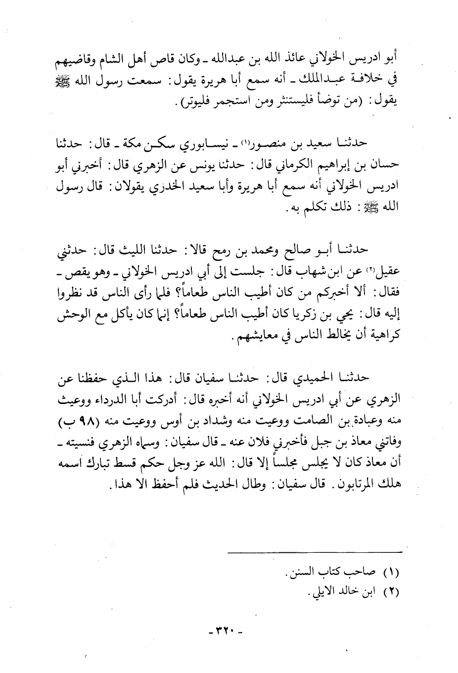 حَدَّثَنَا سَعِيدُ بْنُ مَنْصُورٍ [1]- نَيْسَابُورِيٌّ يَسْكُنُ مَكَّةَ- قَالَ: حَدَّثَنَا حَسَّانُ بْنُ إِبْرَاهِيمَ الْكَرْمَانِيُّ قَالَ: حَدَّثَنَا يُونُسُ عَنِ الزُّهْرِيِّ قَالَ: أَخْبَرَنِي أَبُو إِدْرِيسَ الْخَوْلَانِيُّ أَنَّهُ سَمِعَ أَبَا هُرَيْرَةَ وَأَبَا سَعِيدٍ الْخُدْرِيِّ يَقُولَانِ: