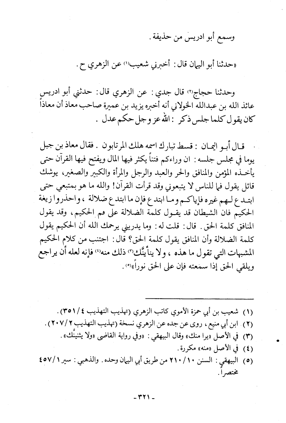 قَالَ أَبُو الْيَمَانِ: قِسْطٌ تَبَارَكَ اسْمُهُ هَلَكَ الْمُرْتَابُونَ. فَقَالَ مُعَاذُ بْنُ جَبَلٍ يَوْمًا فِي مَجْلِسٍ جَلَسَهُ: إِنَّ وَرَاءَكُمْ فِتَنًا يَكْثُرُ فِيهَا الْمَالُ وَيُفْتَحُ فِيهَا الْقُرْآنُ حَتَّى يَأْخُذَهُ الْمُؤْمِنُ وَالْمُنَافِقُ وَالْحُرُّ وَالْعَبْدُ وَالرَّجُلُ وَالْمَرْأَةُ وَالْكَبِيرُ وَالصَّغِيرُ، يُوشِكُ قَائِلٌ يَقُولُ فَمَا لِلنَّاسِ لَا يَتَّبِعُونِي وَقَدْ قَرَأْتُ القرآن! والله ما هو بِمُتَّبِعِيَّ حَتَّى أَبْتَدِعَ لَهُمْ غَيْرَهُ فَإِيَّاكُمْ وَمَا ابْتُدِعَ فَإِنَّ مَا ابْتُدِعَ ضَلَالَةٌ، وَاحْذَرُوا أَرْبَعَةً، الحكيم فإن الشيطان قد يقول كلمة الضلالة عَلَى فَمِ الْحَكِيمِ، وَقَدْ يَقُولُ الْمُنَافِقُ كَلِمَةَ الْحَقِّ. قَالَ: قُلْتُ لَهُ: وَمَا يُدْرِينِي يَرْحَمُكَ اللَّهُ أَنَّ الْحَكِيمَ يَقُولُ كَلِمَةَ الضَّلَالَةِ وَأَنَّ الْمُنَافِقَ يَقُولُ كَلِمَةَ الْحَقِّ؟