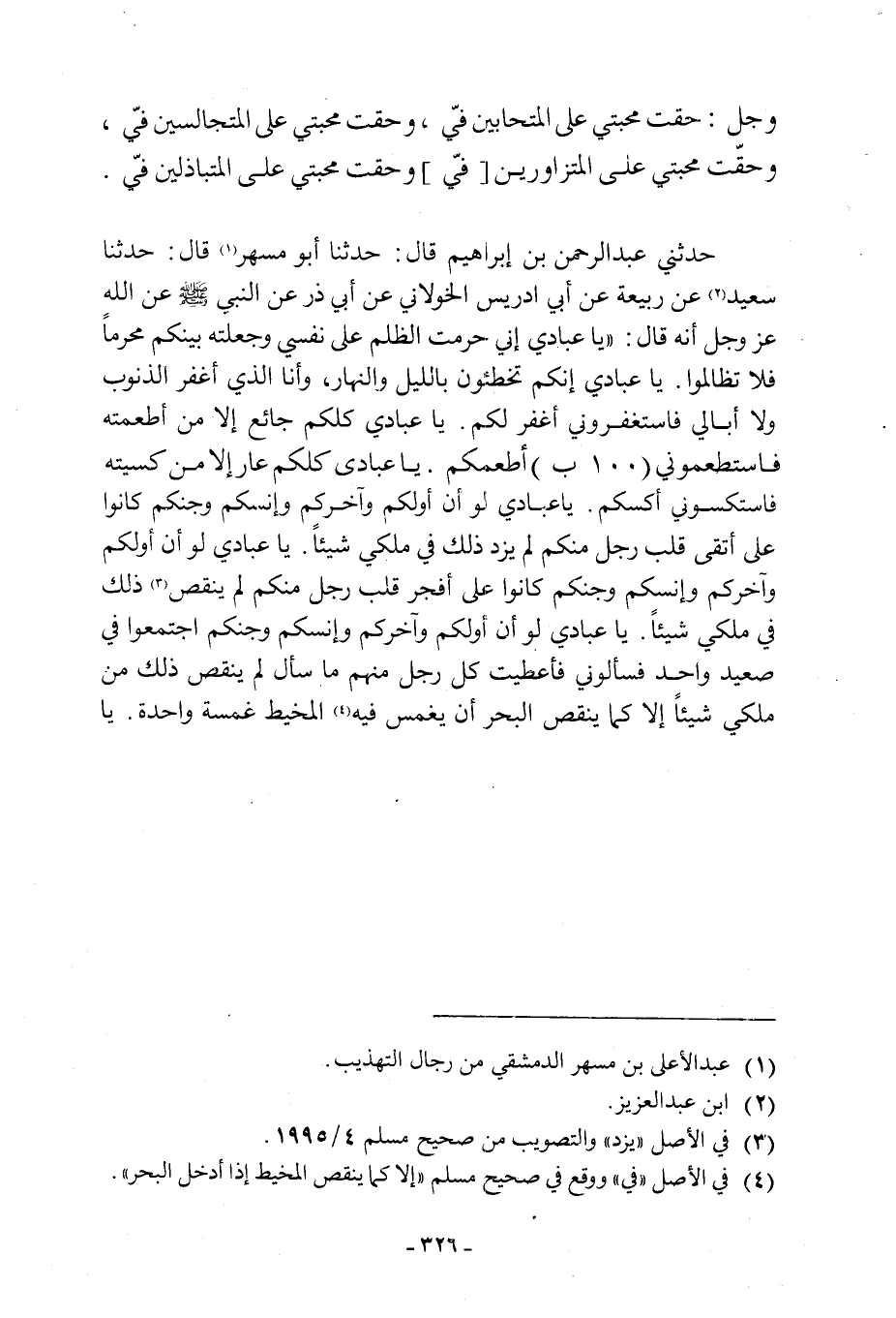 يَا عِبَادِي كُلُّكُمْ عَارٍ إِلَّا مَنْ لبسته فَاسْتَكْسُونِي أَكْسُكُمْ. يَا عِبَادِي لَوْ أَنَّ أَوَّلَكُمْ وَآخِرَكُمْ وَإِنْسَكُمْ وَجِنَّكُمْ كَانُوا عَلَى أَتْقَى قَلْبِ رَجُلٍ مِنْكُمْ لَمْ يَزِدْ ذَلِكَ فِي مُلْكِي شَيْئًا. يَا عِبَادِي لَوْ أَنَّ أَوَّلَكُمْ وَآخِرَكُمْ وَإِنْسَكُمْ وَجِنَّكُمْ كَانُوا عَلَى أَفْجَرِ قَلْبِ رَجُلٍ منكم لم ينقص [3] ذَلِكَ فِي مُلْكِي شَيْئًا. يَا عِبَادِي لَوْ أَنَّ أَوَّلَكُمْ وَآخِرَكُمْ وَإِنْسَكُمْ وَجِنَّكُمُ اجْتَمَعُوا فِي صَعِيدٍ وَاحِدٍ فَسَأَلُونِي فَأَعْطَيْتُ كُلَّ رَجُلٍ مِنْهُمْ مَا سَأَلَ لَمْ يَنْقُصْ ذَلِكَ مِنْ مُلْكِي شَيْئًا إِلَّا كَمَا يَنْقُصُ الْبَحْرُ إِنْ يُغْمَسْ فِيهِ [4] الْمِخْيَطُ غَمْسَةً وَاحِدَةً. يَا عِبَادِي إِنَّمَا هي أعمالكم