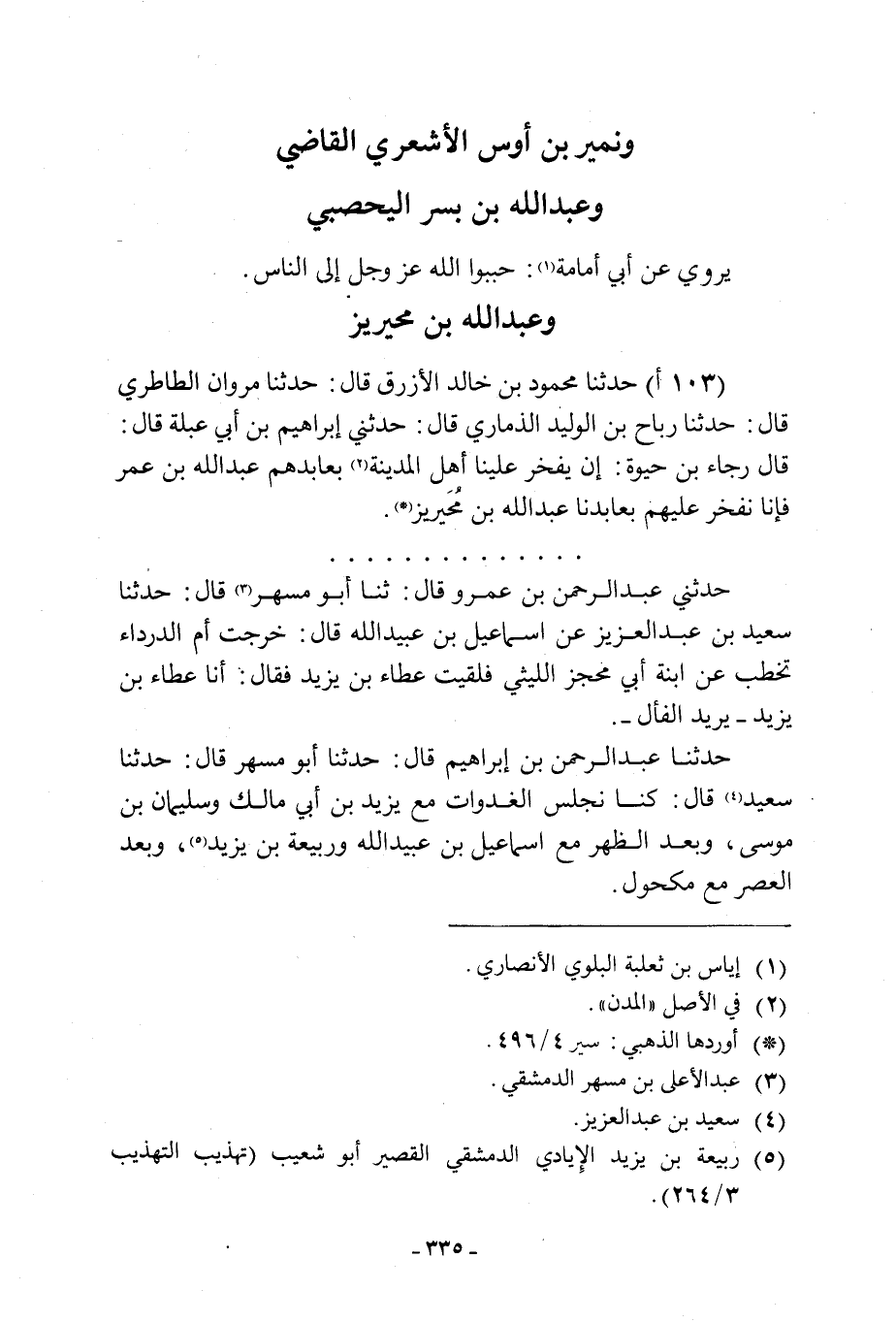 (103 أ) حَدَّثَنَا مَحْمُودُ بْنُ خَالِدٍ الْأَزْرَقُ قَالَ: حَدَّثَنَا مَرْوَانُ الطَّاطَرِيُّ قَالَ: حَدَّثَنَا رَبَاحُ بْنُ الْوَلِيدِ الذِّمَارِيُّ قَالَ: حَدَّثَنِي إِبْرَاهِيمُ بْنُ أَبِي عَبْلَةَ قَالَ: قَالَ رَجَاءُ بْنُ حَيْوَةَ: إِنْ يَفْخَرْ عَلَيْنَا أَهْلُ الْمَدِينَةِ [2] بِعَابِدِهِمْ عَبْدِ اللَّهِ بْنِ عُمَرَ فَإِنَّا نَفْخَرُ عَلَيْهِمْ بِعَابِدِنَا عَبْدِ اللَّهِ بن محيريز.