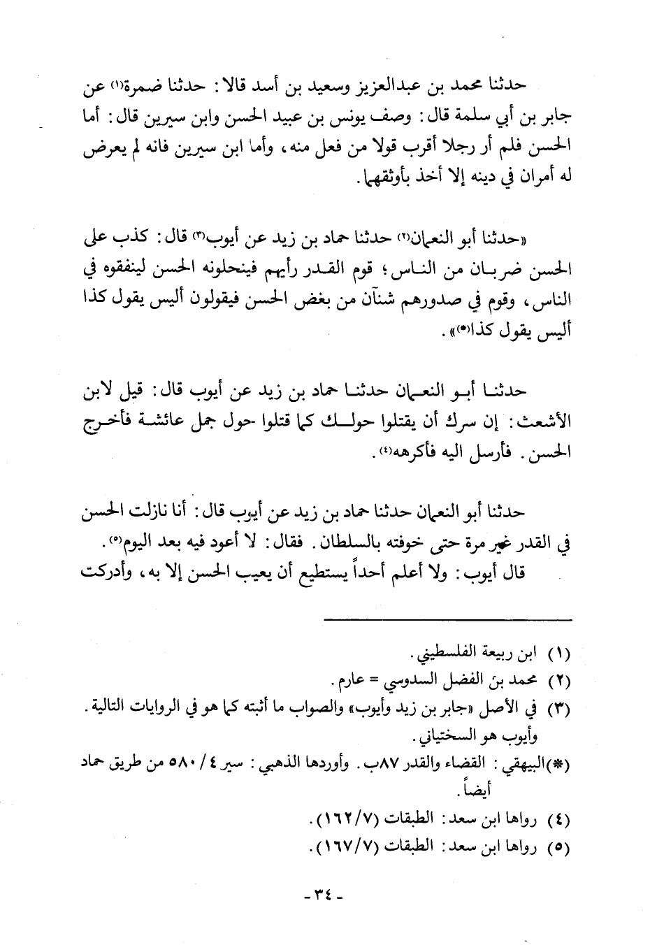 حَدَّثَنَا أَبُو النُّعْمَانِ حَدَّثَنَا حَمَّادُ بْنُ زَيْدٍ عَنْ أَيُّوبَ قَالَ: أَنَا نَازَلْتُ الْحَسَنَ فِي الْقَدَرِ غَيْرَ مَرَّةٍ حَتَّى خَوَّفْتُهُ بِالسُّلْطَانِ. فَقَالَ: لَا أَعُودُ فِيهِ بَعْدَ اليوم [5] .
