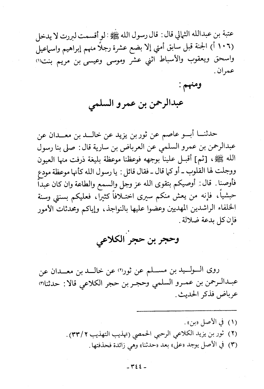 رَوَى الْوَلِيدُ بْنُ مُسْلِمٍ عَنْ ثَوْرٍ [2] عَنْ خَالِدِ بْنِ مَعْدَانَ عَنْ عَبْدِ الرَّحْمَنِ بْنِ عَمْرٍو السُّلَمِيِّ وَحُجْرِ بْنِ حُجْرٍ الكلاعي قالا: حدثنا [3] عرباض فذكر الحديث.
