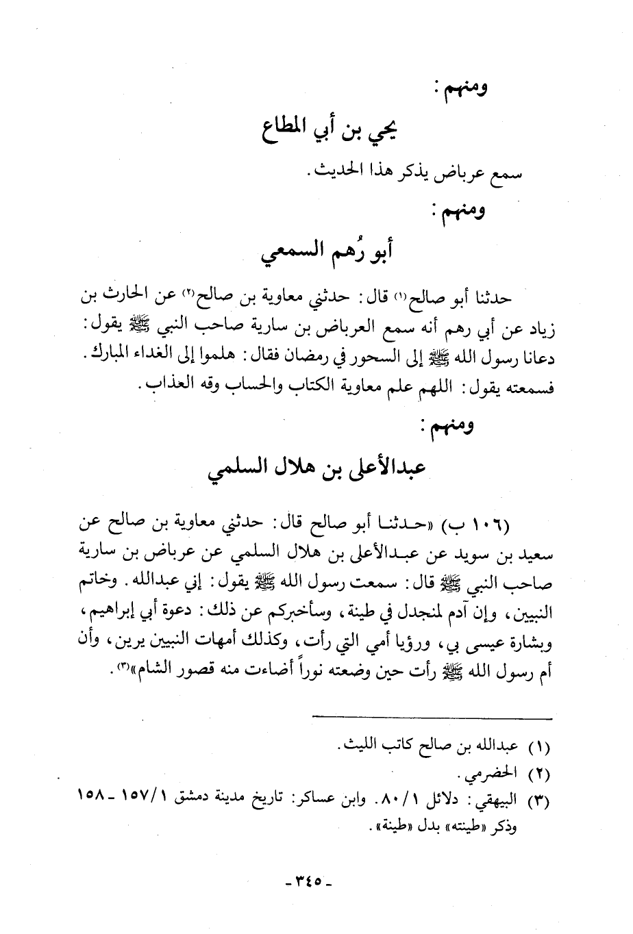 (106 ب) «حَدَّثَنَا أَبُو صَالِحٍ قَالَ: حَدَّثَنِي مُعَاوِيَةُ بْنُ صَالِحٍ عَنْ سَعِيدِ بْنِ سُوَيْدٍ عَنْ عَبْدِ الْأَعْلَى بْنِ هِلَالٍ السُّلَمِيِّ عَنْ عِرْبَاضِ بْنِ سارية صاحب النبي صلى الله عليه وسلم قَالَ: سَمِعْتُ رَسُولَ اللَّهِ صَلَّى اللَّهُ عَلَيْهِ وَسَلَّمَ يَقُولُ: إِنِّي عَبْدُ اللَّهِ، وَخَاتَمُ النَّبِيِّينَ، وَإِنَّ آدَمَ لَمُنْجَدِلٌ فِي طِينَةٍ، وَسَأُخْبِرُكُمْ عَنْ ذَلِكَ: دَعْوَةُ أَبِي إِبْرَاهِيمَ، وَبِشَارَةُ عِيسَى بِي، وَرُؤْيَا أُمِّي الَّتِي رَأَتْ، وَكَذَلِكَ أُمَّهَاتُ النَّبِيِّينَ يَرَيْنَ، وَإِنَّ أُمَّ رَسُولِ اللَّهِ صَلَّى اللَّهُ عليه وسلم رأت حين وضعته نورا أضاءت منه قصور الشام» [3] .