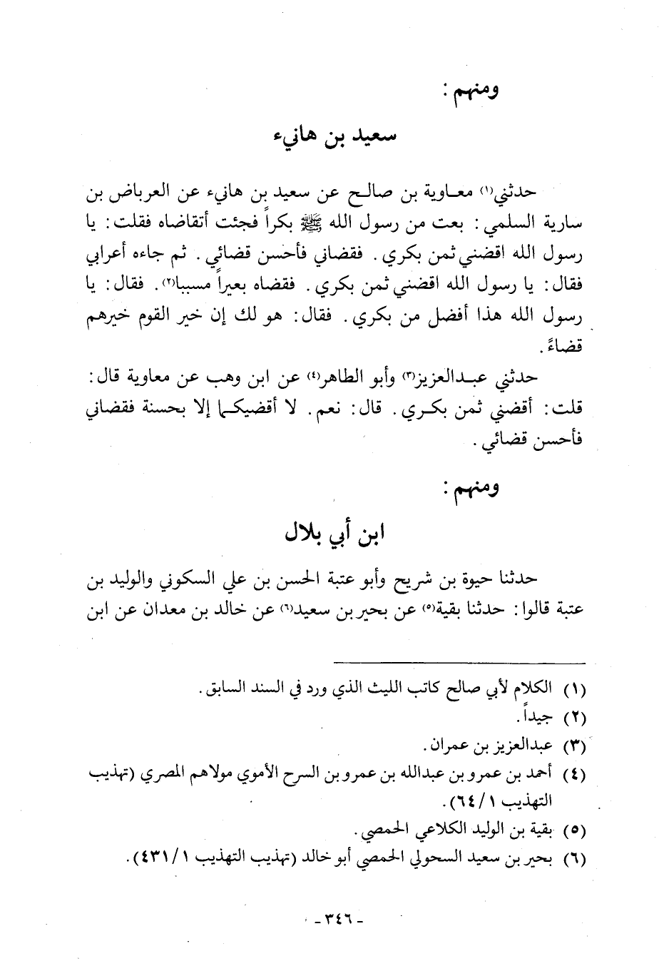 حَدَّثَنِي [1] مُعَاوِيَةُ بْنُ صَالِحٍ عَنْ سَعِيدِ بْنِ هَانِئٍ عَنِ الْعِرْبَاضِ بْنِ سَارِيَةَ السُّلَمِيِّ: بِعْتُ مِنْ رَسُولِ اللَّهِ صَلَّى اللَّهُ عَلَيْهِ وَسَلَّمَ بُكْرًا فَجِئْتُ أَتَقَاضَاهُ فَقُلْتُ: يَا رَسُولَ اللَّهِ اقْضِنِي ثَمَنَ بُكْرِي. فَقَضَانِي فَأَحْسَنَ قَضَائِي. ثُمَّ جَاءَهُ أَعْرَابِيٌّ فَقَالَ: يَا رَسُولَ اللَّهِ اقْضِنِي ثَمَنَ بُكْرِي. فَقَضَاهُ بعيرا مسببا [2] . فقال: يا رسول الله هذا أَفْضَلُ مِنْ بُكْرِي. فَقَالَ: هُوَ لَكَ إِنَّ خَيْرَ الْقَوْمِ خَيْرُهُمْ قَضَاءً. حَدَّثَنِي عَبْدُ الْعَزِيزِ [3] وَأَبُو الطَّاهِرِ [4] عَنِ ابْنِ وَهْبٍ عَنْ مُعَاوِيَةَ قَالَ: قُلْتُ: اقْضِنِي ثَمَنَ بَكْرِي. قَالَ: نَعَمْ. لا أقضيكما إِلَّا بِحَسَنَةٍ فَقَضَانِي فَأَحْسَنَ قَضَائِي.
