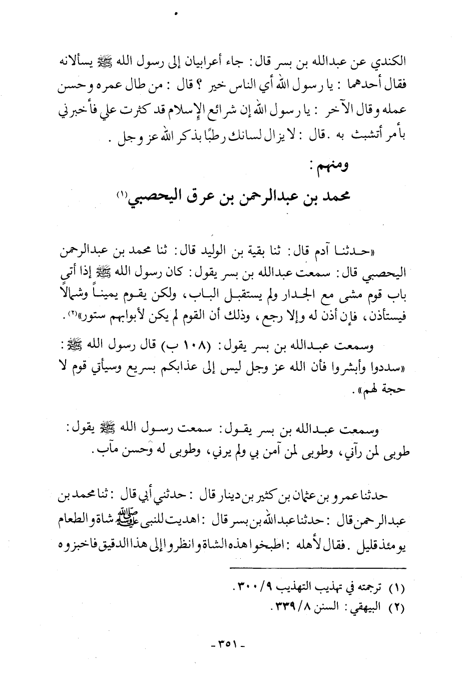 وَسَمِعْتُ عبد الله بن بسر يقول: (108 ب) قَالَ رَسُولُ اللَّهِ صَلَّى اللَّهُ عَلَيْهِ وَسَلَّمَ: «سَدِّدُوا وَأَبْشِرُوا فَإِنَّ اللَّهَ عَزَّ وَجَلَّ لَيْسَ إِلَى عَذَابِكُمْ بِسَرِيعٍ وَسَيَأْتِي قَوْمٌ لَا حُجَّةَ لَهُمْ. وَسَمِعْتُ عَبْدَ اللَّهِ بْنَ بُسْرٍ يَقُولُ: سمعت رسول الله صلى الله عليه وسلم يَقُولُ: طُوبَى لِمَنْ رَآنِي، وَطُوبَى لِمَنْ آمَنَ بِي وَلَمْ يَرَنِي، وَطُوبَى لَهُ وَحُسْنُ مَآبٍ. حَدَّثَنَا عَمْرُو بْنُ عُثْمَانَ بْنِ كَثِيرِ بْنِ دِينَارٍ قَالَ: حَدَّثَنِي أَبِي قَالَ: ثَنَا مُحَمَّدُ بْنُ عَبْدِ الرَّحْمَنِ قَالَ: حَدَّثَنَا عَبْدُ اللَّهِ بْنُ بُسْرٍ قَالَ: أَهْدَيْتُ لِلنَّبِيِّ صَلَّى اللَّهُ عَلَيْهِ وَسَلَّمَ شَاةً. فَقَالَ لِأَهْلِهِ: اطْبُخُوا هَذِهِ الشاة وانظروا الى
