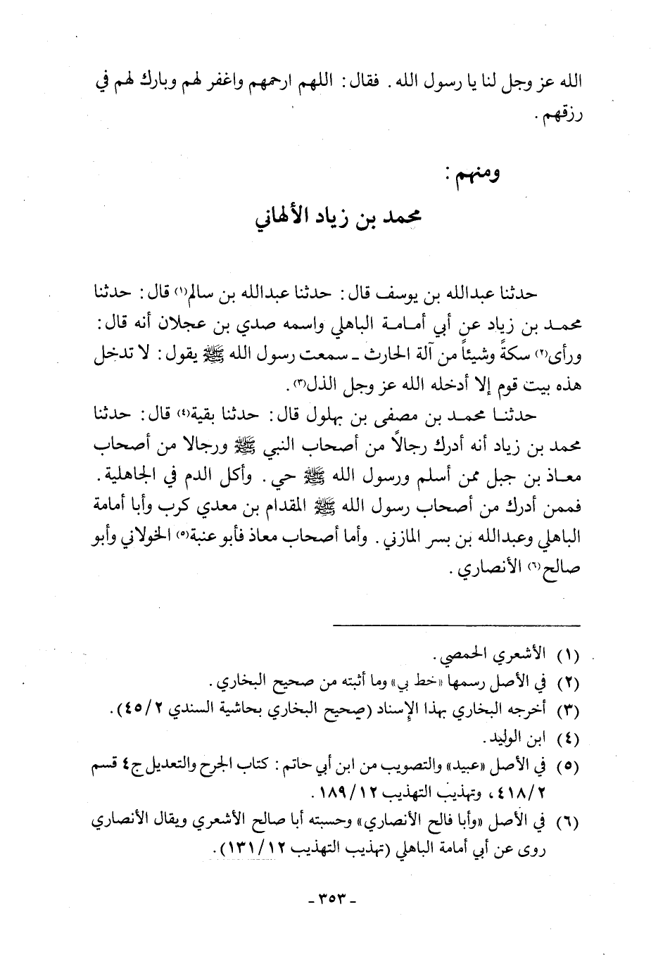 وَرَأَى [2] سِكَّةً وَشَيْئًا مِنْ آلَةِ الْحَارِثِ- سَمِعْتُ رَسُولَ اللَّهِ صَلَّى اللَّهُ عَلَيْهِ وَسَلَّمَ يَقُولُ: لَا تَدْخُلْ هَذِهِ بَيْتَ قَوْمٍ إِلَّا أَدْخَلَهُ اللَّهُ عَزَّ وجَلَّ الذُّلَّ [3] . حَدَّثَنَا مُحَمَّدُ بْنُ مُصَفَّى بْنِ بُهْلُولٍ قَالَ: حَدَّثَنَا بَقِيَّةُ [4] قَالَ: حَدَّثَنَا مُحَمَّدُ بْنُ زِيَادٍ أَنَّهُ أَدْرَكَ رِجَالًا مِنْ أَصْحَابِ النَّبِيِّ صَلَّى اللَّهُ عَلَيْهِ وَسَلَّمَ وَرِجَالًا مِنْ أَصْحَابِ مُعَاذِ بْنِ جَبَلٍ مِمَّنْ أَسْلَمَ وَرَسُولُ اللَّهِ صَلَّى اللَّهُ عَلَيْهِ وَسَلَّمَ حَيٌّ. وَأَكَلَ الدَّمَ فِي الْجَاهِلِيَّةِ. فَمِمَّنْ أَدْرَكَ مِنْ أَصْحَابِ رَسُولِ اللَّهِ صَلَّى اللَّهُ عَلَيْهِ وَسَلَّمَ الْمِقْدَامَ بن معديكرب وَأَبَا أُمَامَةَ الْبَاهِلِيَّ وَعَبْدَ اللَّهِ بْنَ بُسْرٍ الْمَازِنِيَّ. وَأَمَّا أَصْحَابُ مُعَاذٍ فَأَبُو عِنَبَةَ [5] الْخَوْلَانِيُّ وابو صالح [6] الأنصاري.