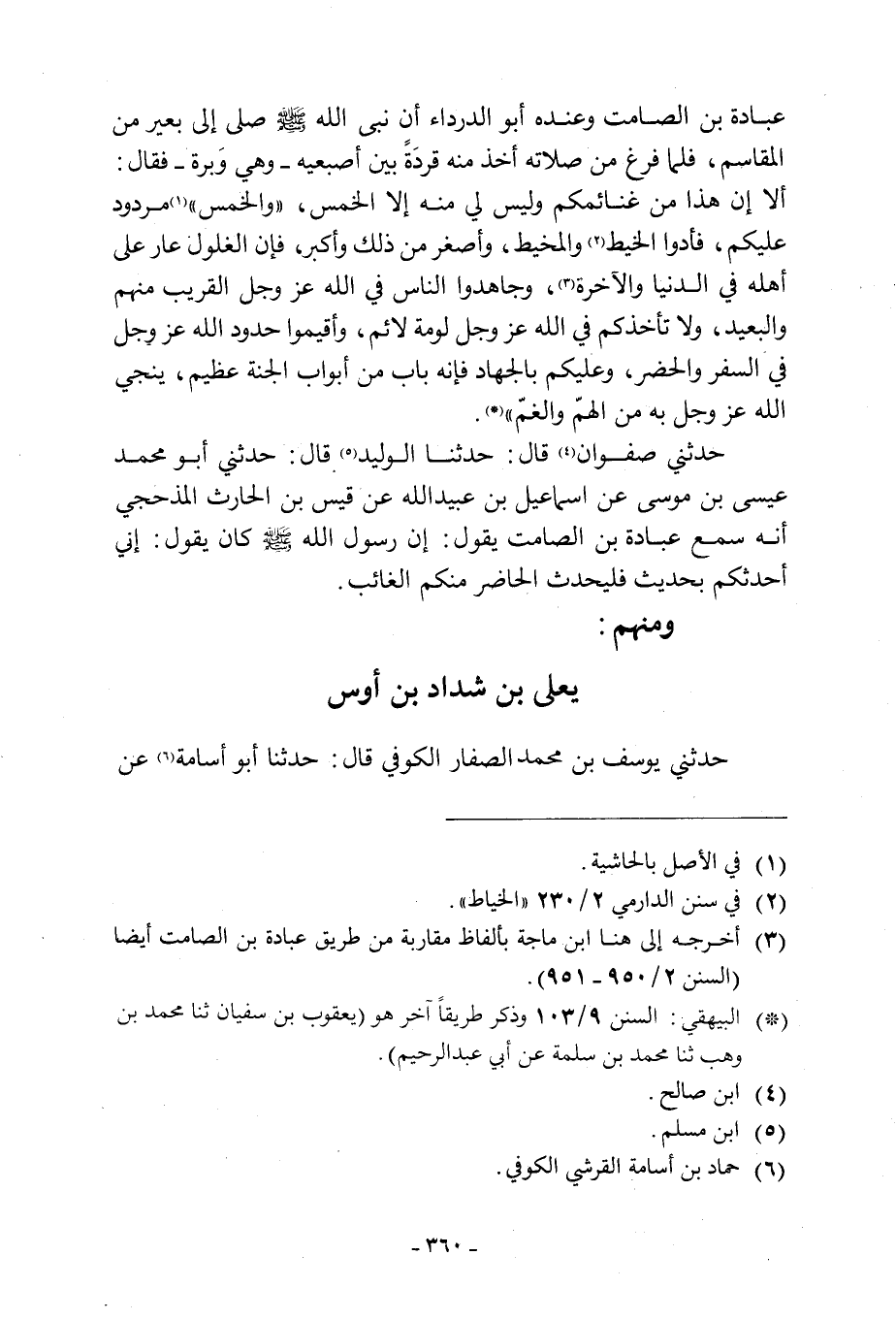 قَالَ: حَدَّثَنَا عُبَادَةُ بْنُ الصَّامِتِ وَعِنْدَهُ أَبُو الدَّرْدَاءِ أَنَّ نَبِيَّ اللَّهِ صَلَّى اللَّهُ عَلَيْهِ وَسَلَّمَ صَلَّى إِلَى بَعِيرٍ مِنَ الْمَقَاسِمِ، فَلَمَّا فَرَغَ مِنْ صَلَاتِهِ أَخَذَ مِنْهُ قَرَدَةً بَيْنَ إِصْبَعَيْهِ- وَهِيَ وَبَرَةٌ- فَقَالَ: أَلَا إِنَّ هَذَا مِنْ غَنَائِمِكُمْ وَلَيْسَ لِي مِنْهُ إِلَّا الْخُمُسُ، «وَالْخُمُسُ» [1] مَرْدُودٌ عَلَيْكُمْ، فَأَدُّوا الْخَيْطَ [2] وَالْمِخْيَطَ، وَأَصْغَرَ مِنْ ذَلِكَ وَأَكْبَرَ، فَإِنَّ الْغُلُولَ عَارٌ عَلَى أَهْلِهِ فِي الدُّنْيَا وَالْآخِرَةِ [3] ، وَجَاهِدُوا النَّاسَ فِي اللَّهِ عَزَّ وَجَلَّ الْقَرِيبَ مِنْهُمْ وَالْبَعِيدَ، وَلَا تَأْخُذْكُمْ فِي اللَّهِ عَزَّ وَجَلَّ لَوْمَةُ لَائِمٍ، وَأَقِيمُوا حُدُودَ اللَّهِ عَزَّ وَجَلَّ فِي السَّفَرِ وَالْحَضَرِ، وَعَلَيْكُمْ بِالْجِهَادِ فَإِنَّهُ بَابٌ مِنْ أَبْوَابِ الْجَنَّةِ عَظِيمٌ، يُنَجِّي اللَّهُ عَزَّ وَجَلَّ بِهِ مِنَ الْهَمِّ وَالْغَمِّ. حَدَّثَنِي صَفْوَانُ [4] قَالَ: حَدَّثَنَا الْوَلِيدُ [5] قَالَ: حَدَّثَنِي أَبُو مُحَمَّدٍ عِيسَى بْنُ مُوسَى عَنْ إِسْمَاعِيلَ بْنِ عُبَيْدِ اللَّهِ عَنْ قَيْسِ بْنِ الْحَارِثِ الْمَذْحِجِيِّ أَنَّهُ سَمِعَ عُبَادَةَ بْنَ الصَّامِتِ يَقُولُ: إِنَّ رَسُولَ اللَّهِ صَلَّى اللَّهُ عَلَيْهِ وَسَلَّمَ كَانَ يَقُولُ: إِنِّي أُحَدِّثُكُمْ بِحَدِيثٍ فَلْيُحَدِّثِ الْحَاضِرُ مِنْكُمُ الْغَائِبَ.