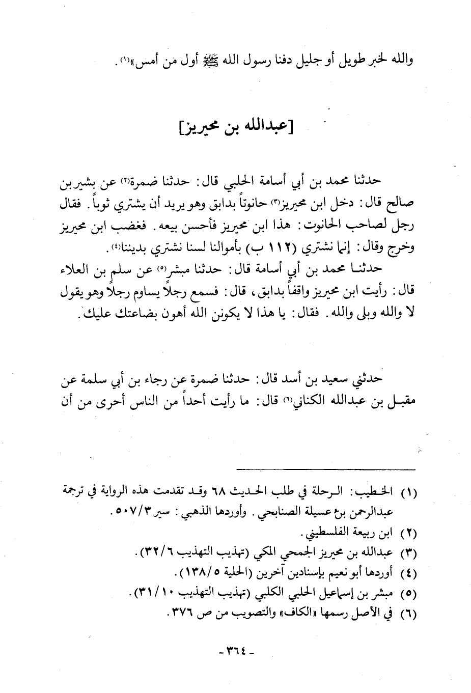[1] الخطيب: الرحلة في طلب الحديث 68 وقد تقدمت هذه الرواية في ترجمة عبد الرحمن بن عسيلة الصنابحي.